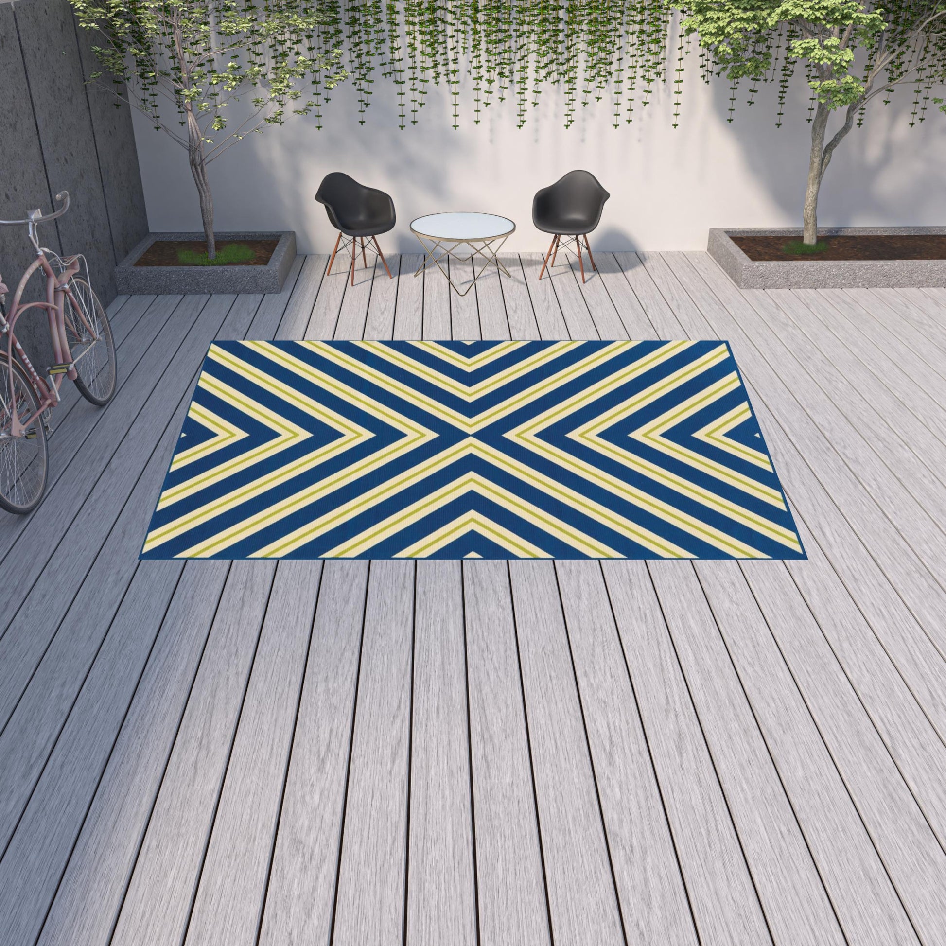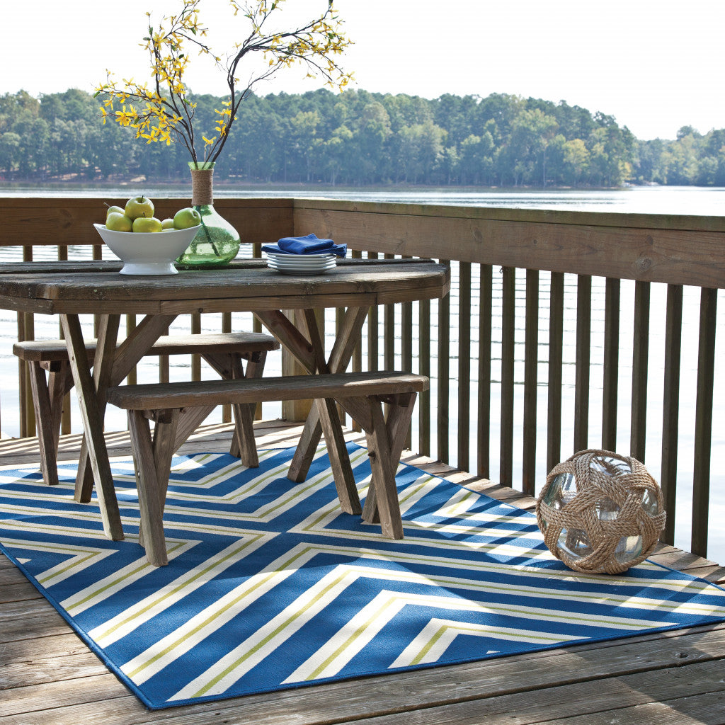 This 9-foot x 13-foot blue and ivory geometric stain resistant indoor outdoor area rug, is a great way to add warmth to a room. This rectangle shaped rug features a geometric design in blue and ivory to give it visual interest. A classic shape marries with good looking design for your space Ideal for spaces with kids and pets, this rug is stain resistant to help repel stains and spilled liquids. Place this area rug against a hardwood or tile floor and it will enliven your living space with style and sophistication. 0.16-inch H x 101.97-inch W x 155.91-inch D