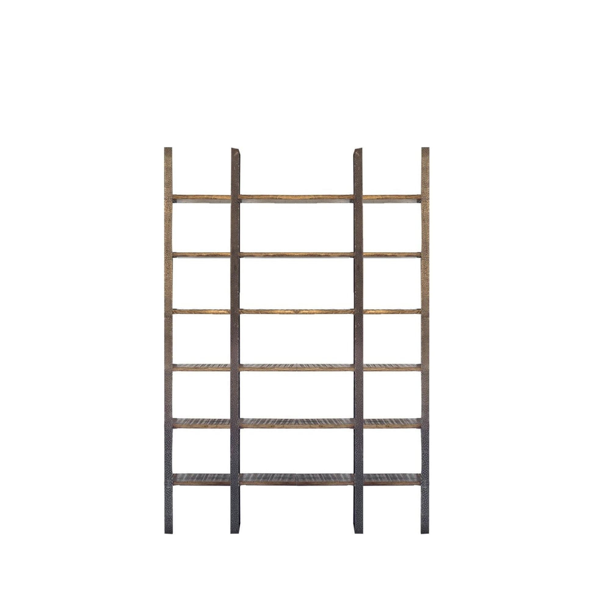 This brown wood and iron six tier shelving unit is the perfect way to add some contemporary design mixed with practical utility to your home. This shelving unit has a brown iron frame with two side edges and two pieces in the middle. The shelves are made of solid wood and have a dark brown varnish on them which show details and wood grain through them. This shelving unit will look great with decor pieces, books and even plants on it. The neutral colorway and the minimal design will look good in any room of your home and will elevate the whole space. 90-inch H x 10.5-inch W x 80-inch D