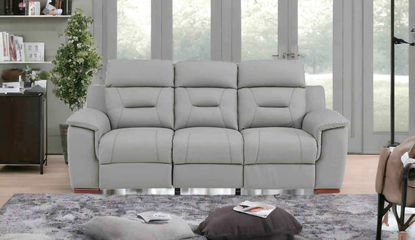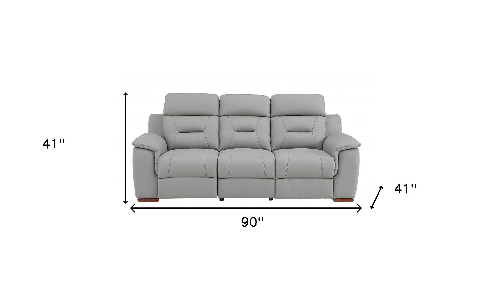 With a look and feel like leather, this 90-inch gray and brown faux leather sofa is made from sturdy and resilient faux leather to stand up to the test of time. Solid colors give you lots of decorative options and are easy to work into your decor scheme. Pillow top arms offer a comfy place to rest. Brown stainless steel legs effortlessly elevate the room and add a touch of contemporary design. Built to last, this sofa will be a great centerpiece for your room. 41-inch H x 90-inch W x 41-inch D
