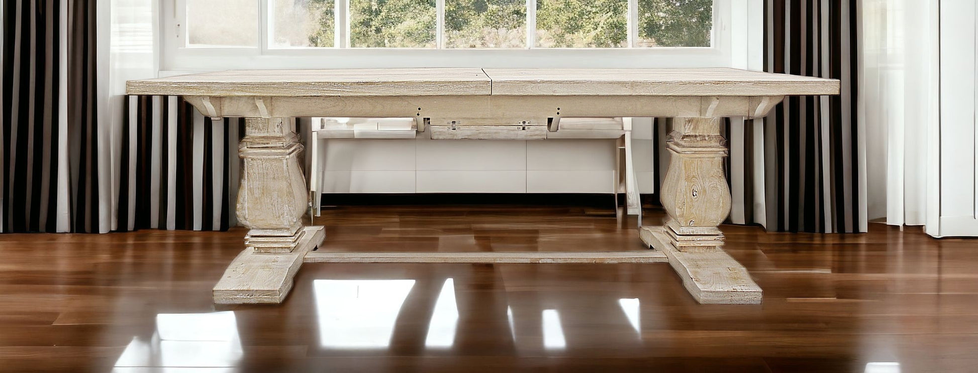 Make a statement with the 90" light brown rectangular solid wood butterfly leaf dining table and infuse a dash of character and personality into your space. This table is made from solid wood in a light brown color throughout the base and top. The purposefully distressed finish gives this table an authentically rustic feel. A beautiful trestle base adds some dimension and elegance to your dining. When fully extended, this dining table seats up to 10 people. Complete your kitchen or dining room with this well made and stylish table. This eye-catching dining table is ready for you to enjoy breakfast for one or entertain your guests. 32" H x 90" W x 39" D