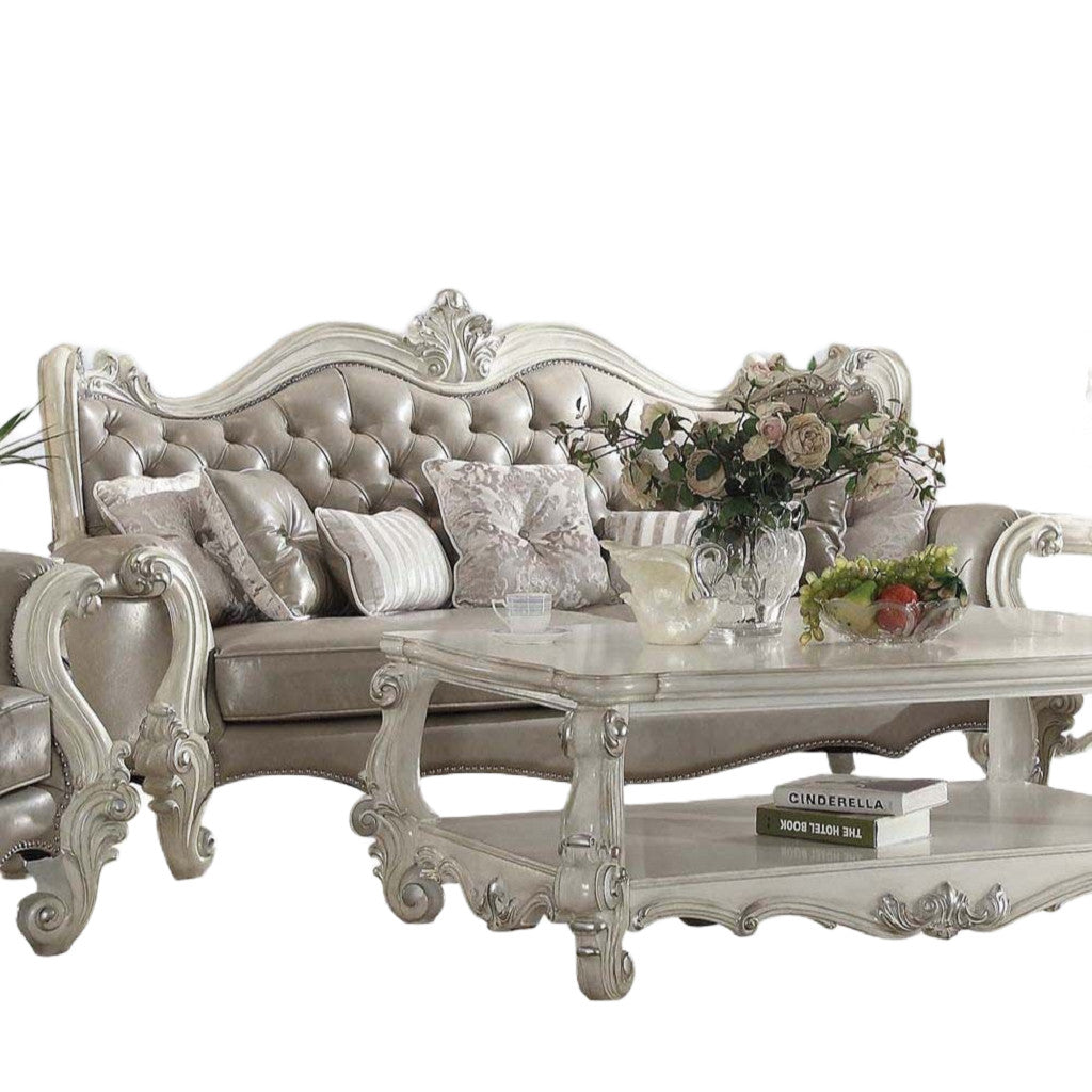 With a look and feel like leather, this 90" vintage gray faux leather and bone sofa with seven toss pillows is made from sturdy and resilient polyurethane to stand up to the test of time. Solid colors give you lots of decorative options and are easy to work into your decor scheme. This piece includes high end detailing such as nailhead trim for a refined look. Rolled arms offer a comfy place to rest. The tufted stitching pattern adds visual interest and fine designer detailing. A great showpiece for your room, this sofa is a must have. 51" H x 90" W x 4" D