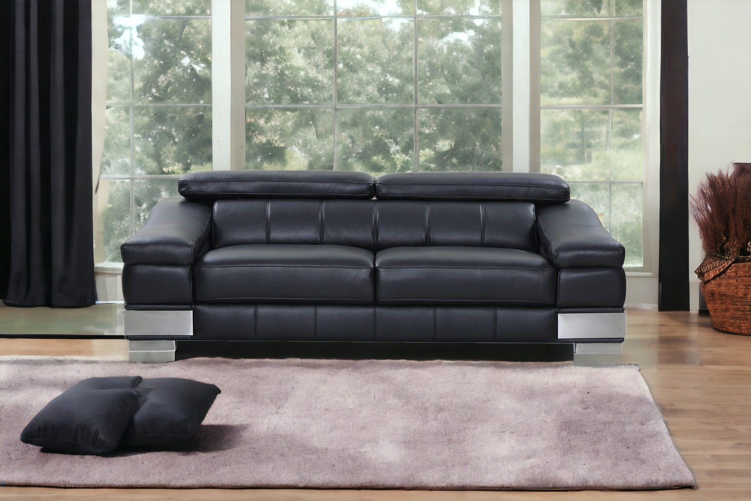 Made of the highest quality, supple leather, this 92-inch black and silver italian leather sofa will be the star of your space. The high grade premium leather used makes your lounging luxuriously comfortable and adds an elegant appeal to your space. Solid colors give you lots of decorative options and are easy to work into your decor scheme. Sinuous springs construction gives this piece strong support and makes it comfortable to sit even for long periods of time. Pillow top arms offer a comfy place to rest. Silver stainless steel legs effortlessly elevate the room and add a touch of contemporary design. A great showpiece for your room, this sofa is a must have. 31-inch H x 92-inch W x 43-inch D