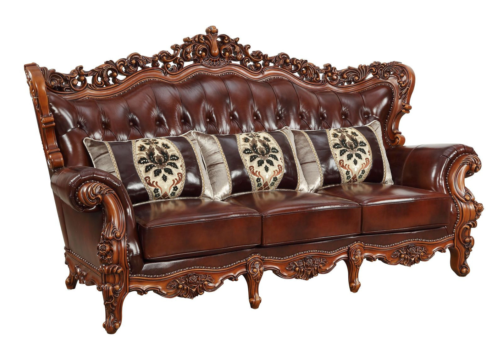 With a look and feel like leather, this 92-inch brown faux leather sofa and toss pillows is made from sturdy and resilient leather match to stand up to the test of time. Solid colors give you lots of decorative options and are easy to work into your decor scheme. Coil spring construction gives this piece strong support and makes it comfortable to sit even for long periods of time. This piece includes high end detailing such as nailhead trim for a refined look. Rolled arms offer a comfy place to rest. The tufted stitching pattern adds visual interest and fine designer detailing. Brown solid wood legs effortlessly elevate the room and add a touch of contemporary design. A great showpiece for your room, this sofa is a must have. 52-inch H x 92-inch W x 41-inch D