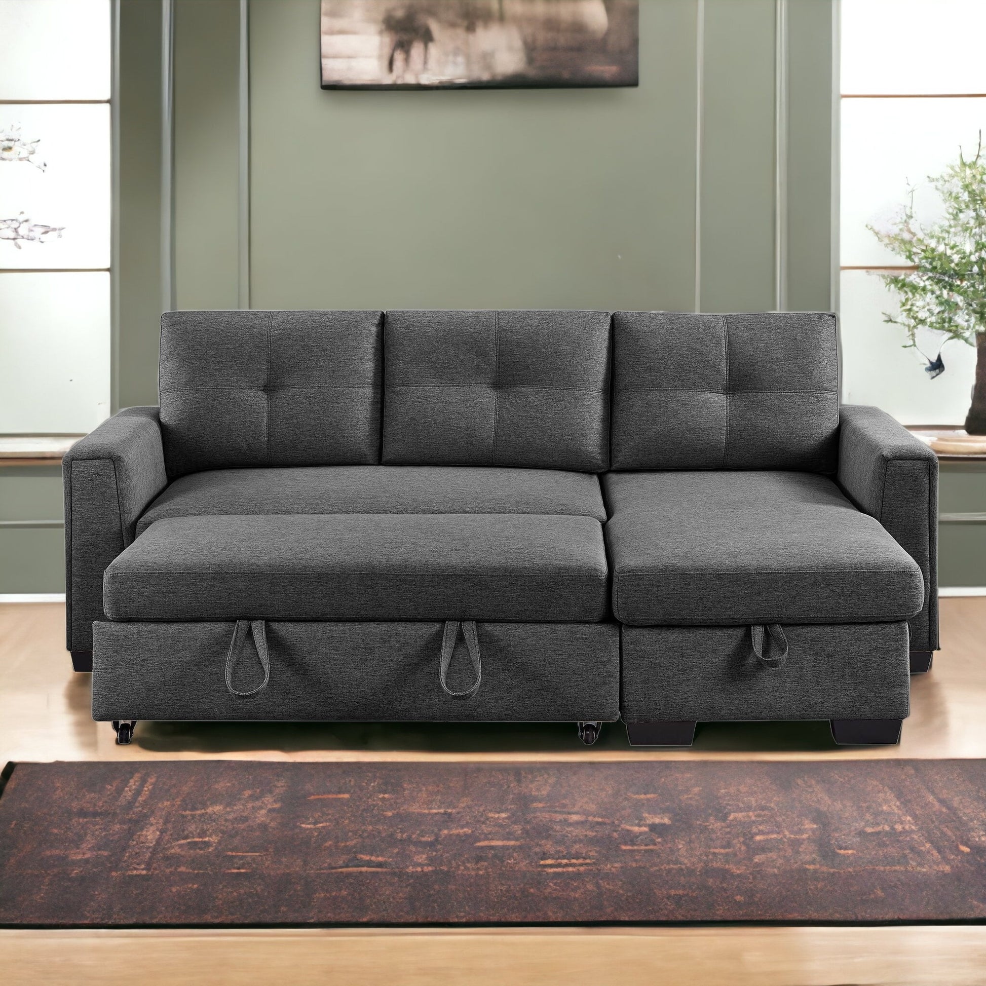 Transform your home's interior with this luxurious 92-inch dark gray polyester blend and black convertible futon sleeper sofa. This solid color convertible futon is made from soft, sturdy, and resilient polyester blend that is a good option for families and in frequently used seating areas. Solid colors give you lots of decorative options and are easy to work into your decor scheme. Pocket spring construction gives this piece strong support and makes it comfortable to sit even for long periods of time. Removable back cushions make this sofa easy to manage. Track arms offer a comfy place to rest. Black solid wood legs effortlessly elevate the room and add a touch of contemporary design. A great showpiece for your room, this sofa is a must have. 36-inch H x 92-inch W x 59-inch D