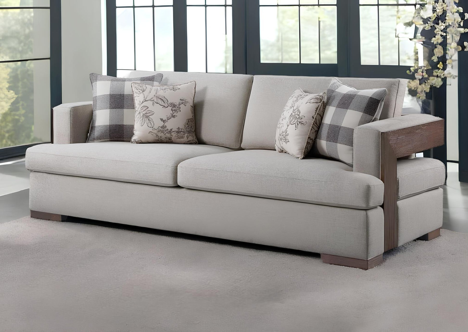 Designed for comfort and good looks, this 92" fabric linen and brown sofa with four toss pillows is a great option to anchor your space. Solid colors give you lots of decorative options and are easy to work into your decor scheme. Track arms offer a comfy place to rest. Built to last, this sofa will be a great centerpiece for your room. 34" H x 92" W x 38" D