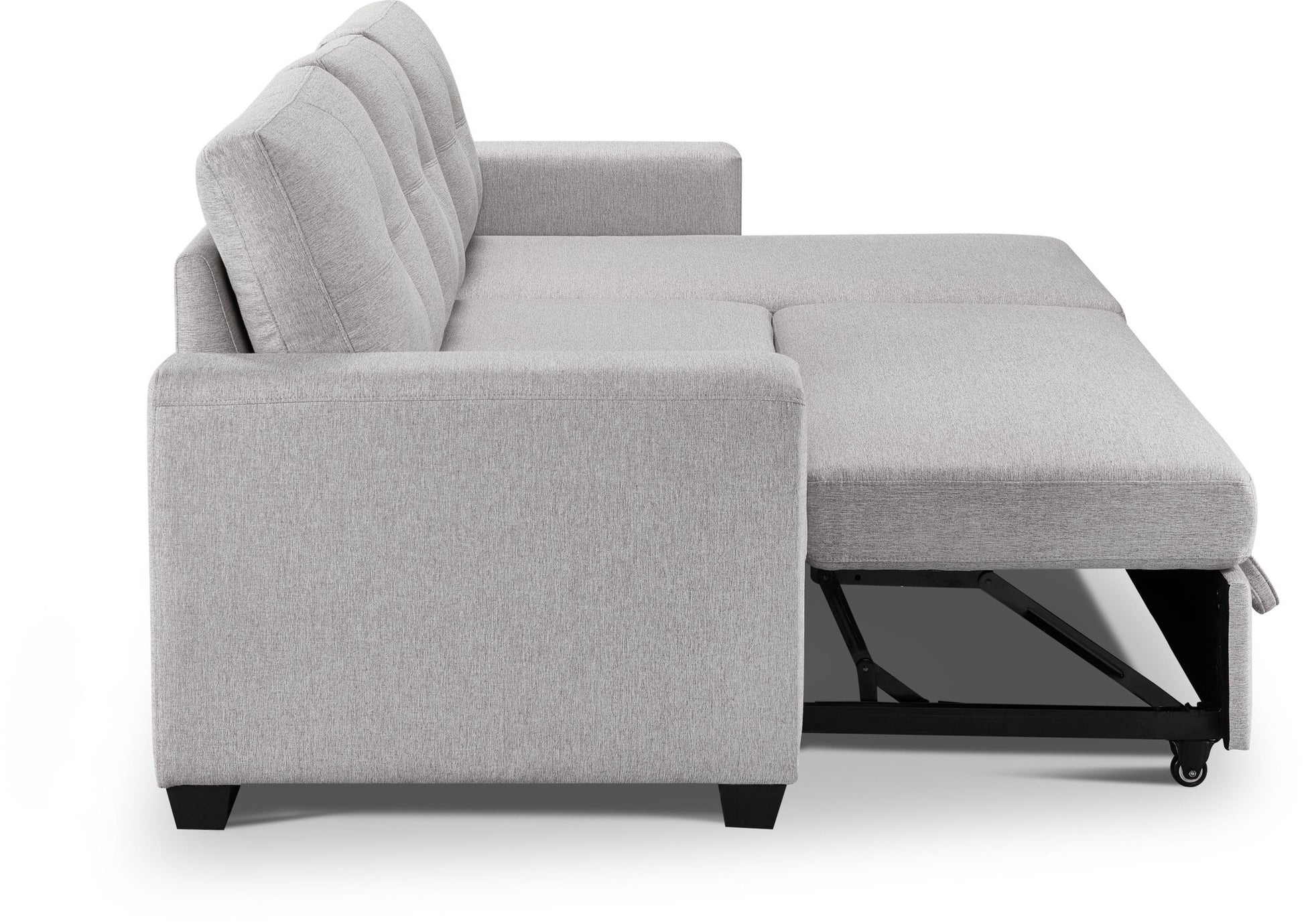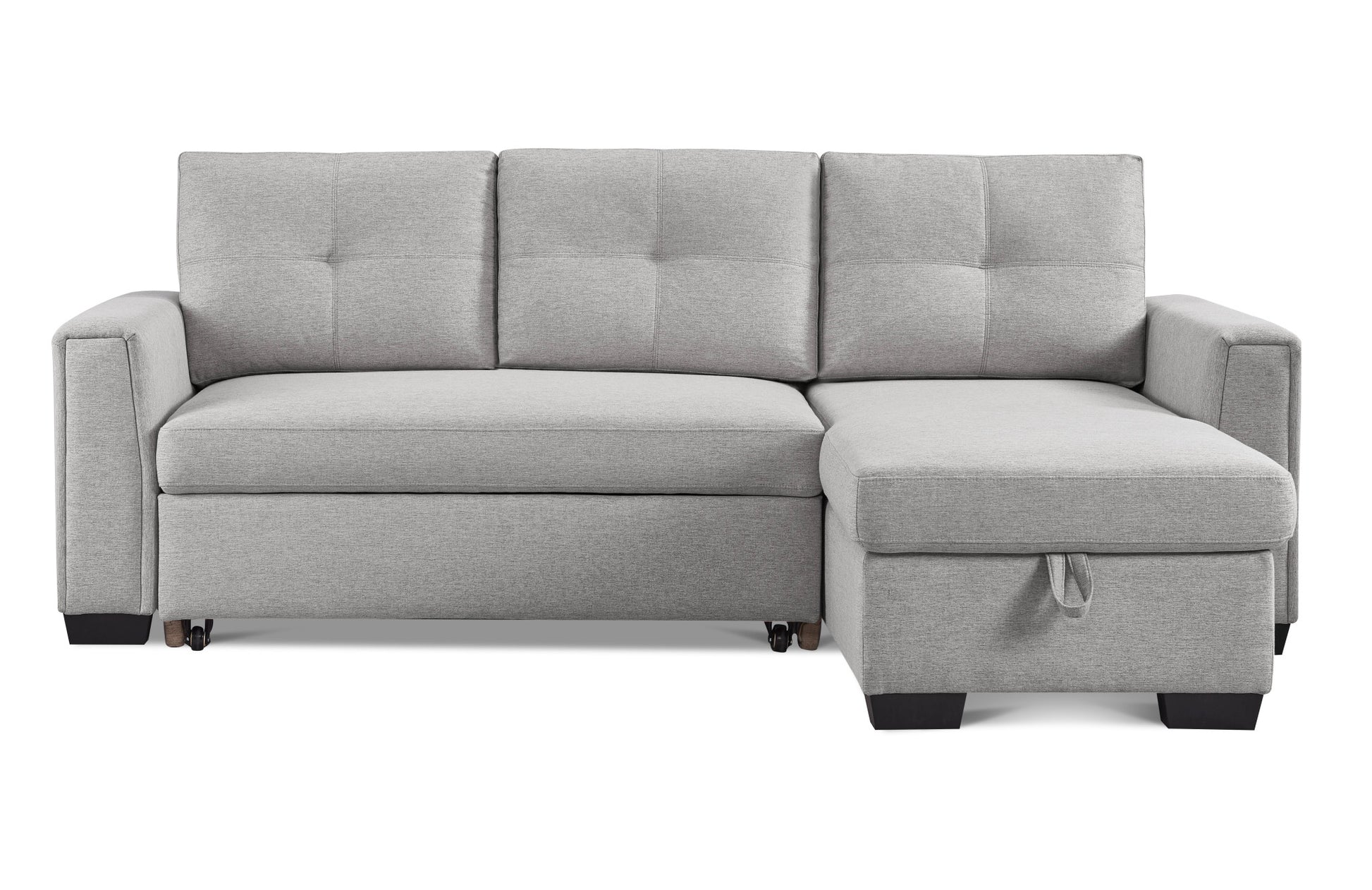 Add an air of fashion to your space with this fabulous 92-inch light gray polyester blend and black convertible futon sleeper sofa. Built to last, this solid color convertible futon is upholstered with polyester blend that is designed to be soft, resilient, easy to maintain, and stand the test of time. Solid colors give you lots of decorative options and are easy to work into your decor scheme. Pocket spring construction gives this piece strong support and makes it comfortable to sit even for long periods of time. Removable back cushions make this sofa easy to manage. Track arms offer a comfy place to rest. Black solid wood legs effortlessly elevate the room and add a touch of contemporary design. Built to last, this futon sofa will be great for seating and adding extra sleeping space to your room. 36-inch H x 92-inch W x 59-inch D