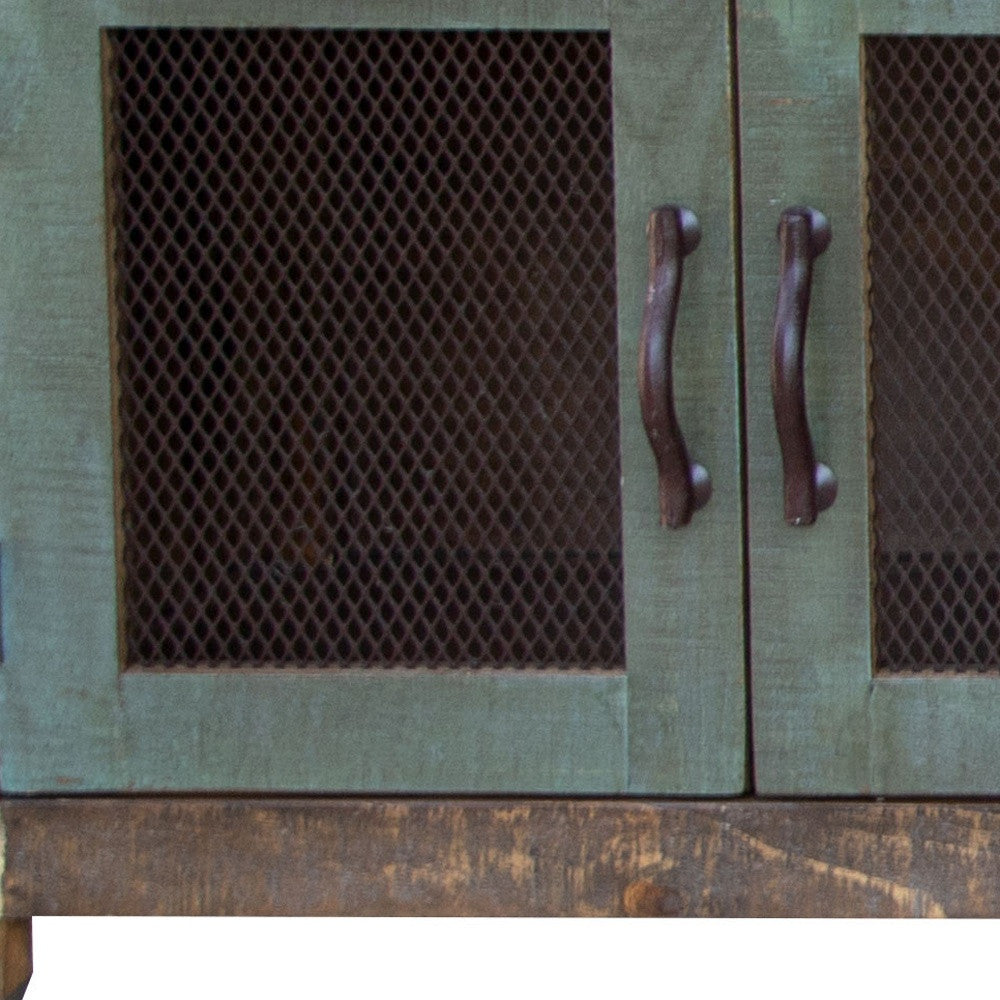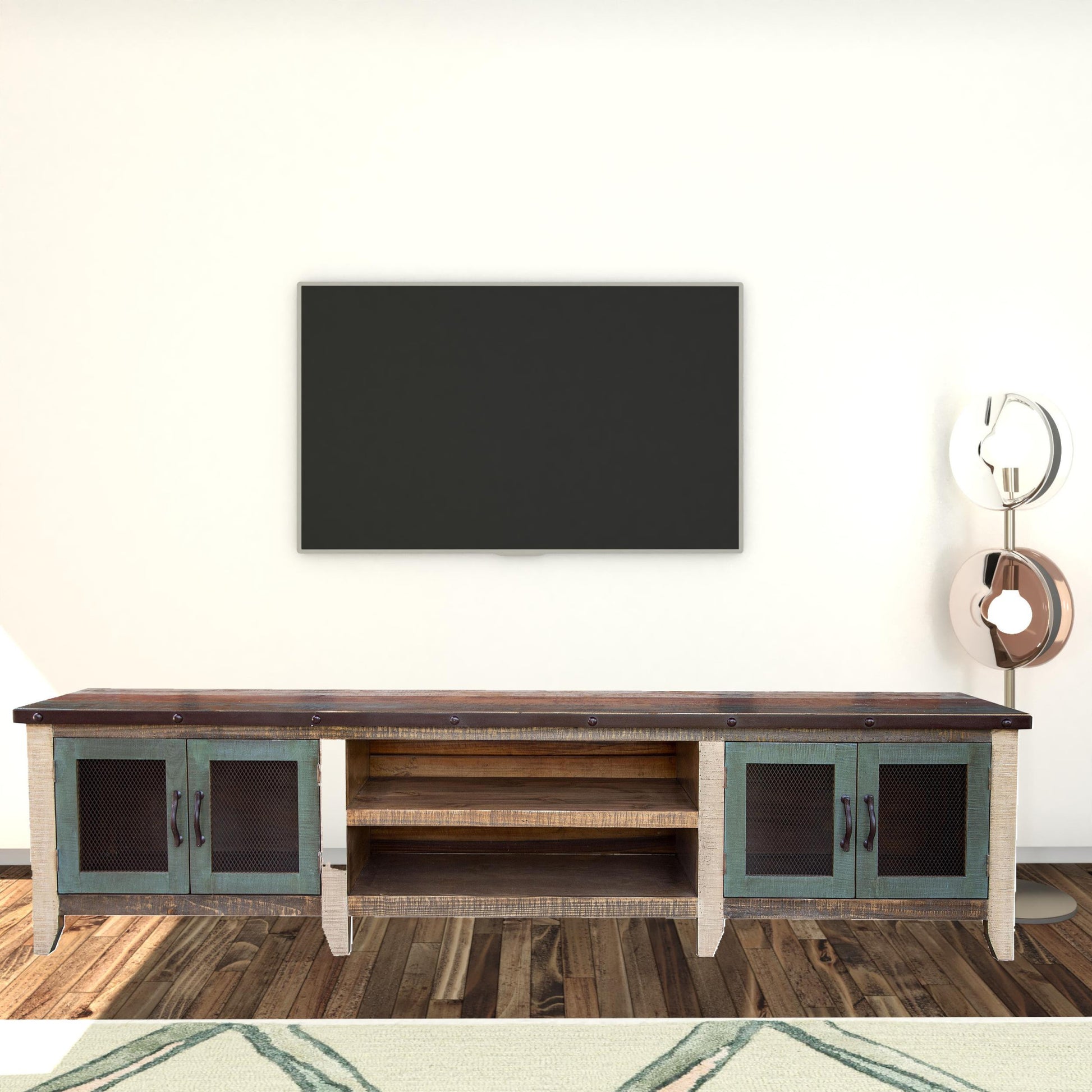 Create the ultimate blend of style, function, and design with this 93" brown solid wood cabinet enclosed storage distressed tv stand. Curated from a mix of high quality solid pine wood and durable manufactured wood, this console is beautiful, and built to last. Due to the genuine nature of the wood some natural wood knots, and grain and color variations may occur. G To add to the versatility, this piece features open non-concealed storage that can be used for not only storage but display as well. Built-in cable and wire management helps to keep those unseamly wires at bay. Convert your room into a special place with your favorite collectibles and TV accessories that is suitable for living room, bedroom, or office. 27" H x 92.5" W x 15.75" D