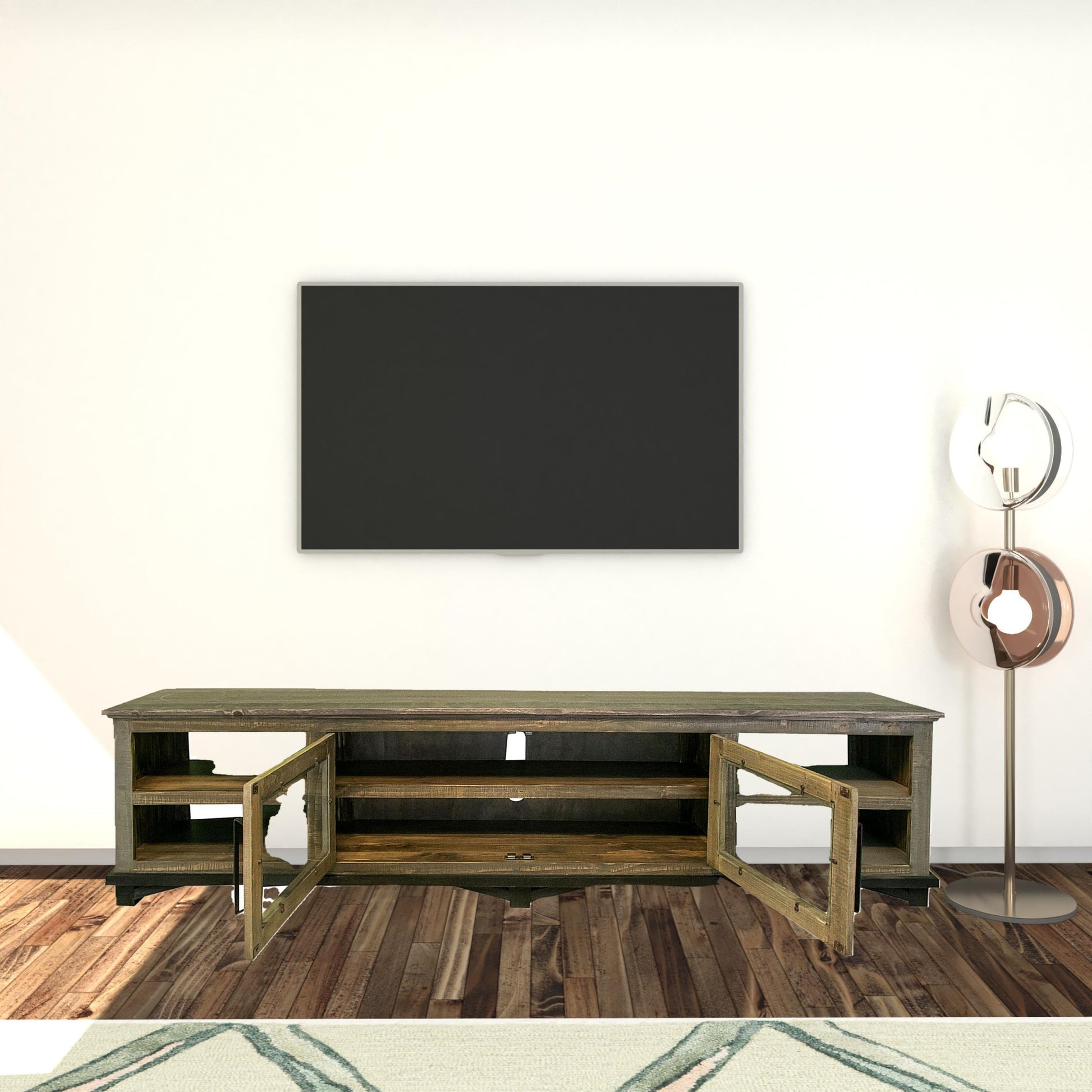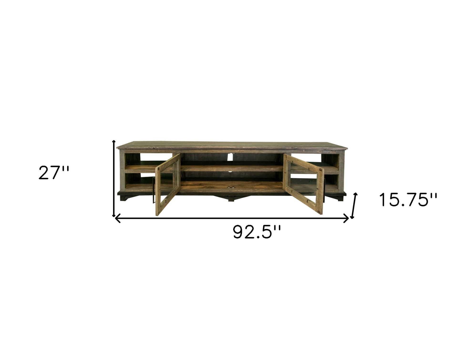 Practical, space saving, and good looking, this 93" brown solid wood cabinet enclosed storage distressed tv stand is a versatile media storage solution. Curated from high quality solid pine wood, this console is natural, beautiful, and built to last. Due to the genuine nature of the wood some natural wood knots, and grain and color variations may occur. L To add to the versatility, this piece features open non-concealed storage that can be used for not only storage but display as well. Built-in cable and wire management helps to keep those unseamly wires at bay. Convert your room into a special place with your favorite collectibles and TV accessories that is suitable for living room, bedroom, or office. 27" H x 92.5" W x 15.75" D