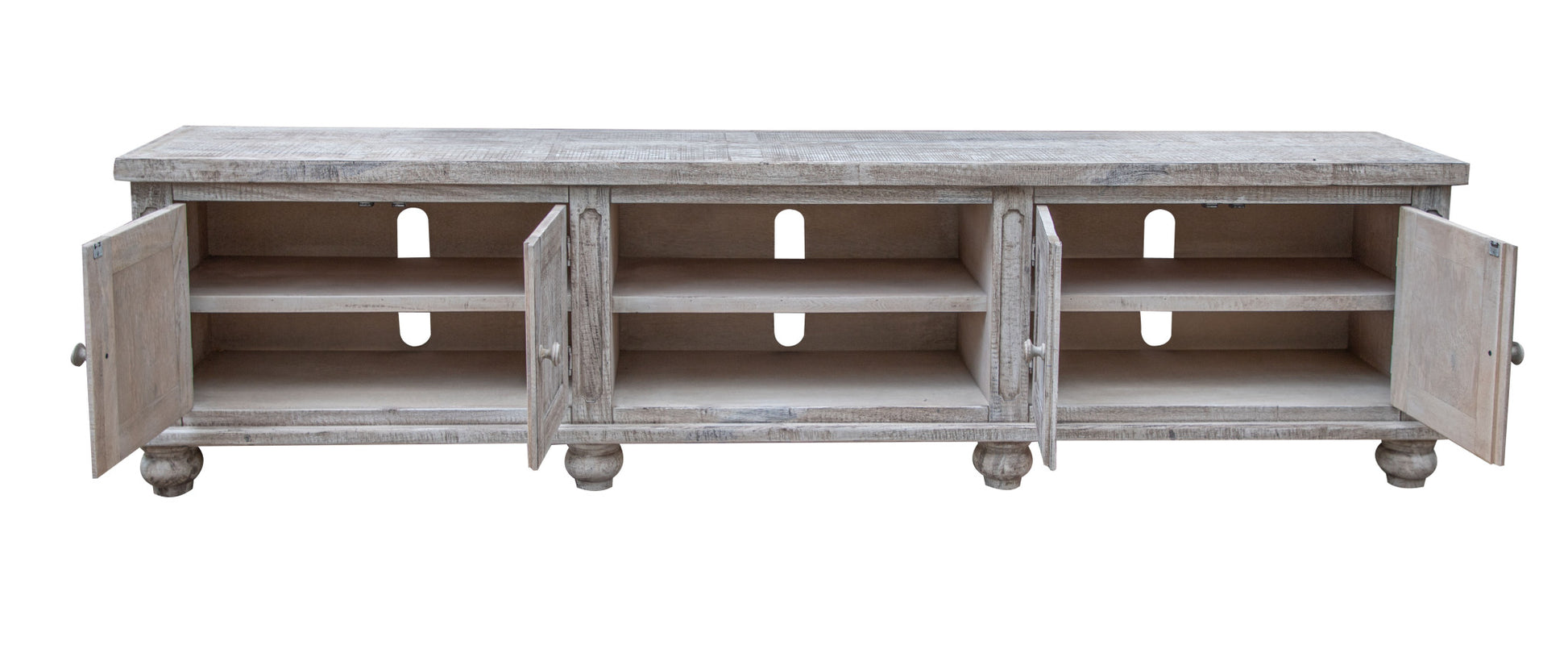 Ready to be enjoyed in your living room, family room, or recreation room, this 93" desert sand solid wood cabinet enclosed storage distressed tv stand is a practical and good looking piece of furniture that will help to anchor your room. Curated from a mix of high quality solid pine wood and durable manufactured wood, this console is beautiful, and built to last. Due to the genuine nature of the wood some natural wood knots, and grain and color variations may occur. To add to the versatility, this piece features open non-concealed storage that can be used for not only storage but display as well. Built-in cable and wire management helps to keep those unseamly wires at bay. Ideal for tv placement and storage in your living room, bedroom or office. 27" H x 93" W x 15.75" D