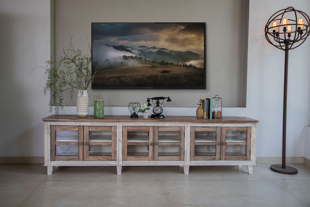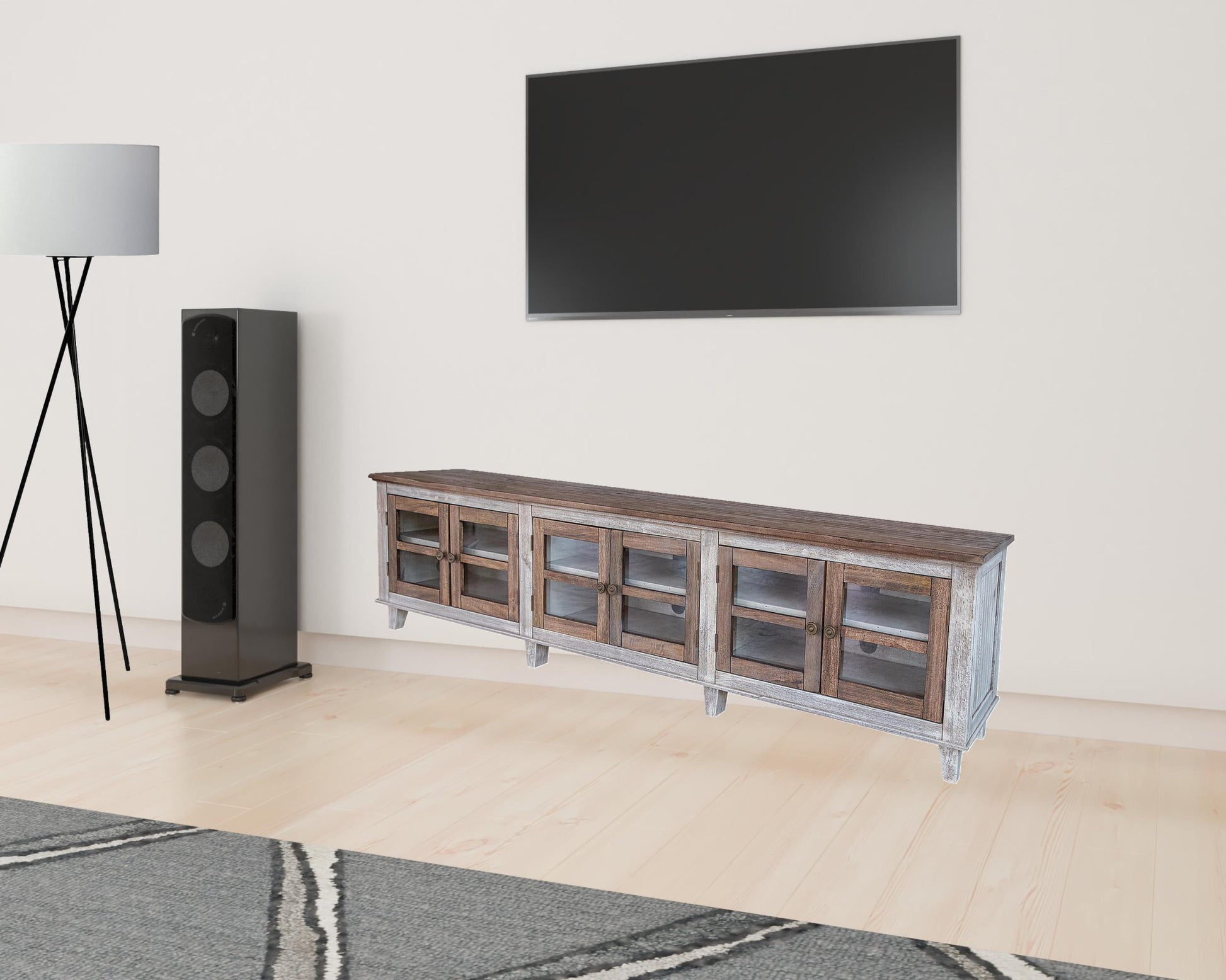 Make a true home theater of your room with this captivating 93" gray and ivory solid wood cabinet enclosed storage distressed tv stand. Curated from a mix of high quality solid mango wood and durable manufactured wood, this console is beautiful, and built to last. Due to the genuine nature of the wood some natural wood knots, and grain and color variations may occur. Built-in cable and wire management helps to keep those unseamly wires at bay. Ideal for tv placement and storage in your living room, bedroom or office. 27" H x 93" W x 15.75" D
