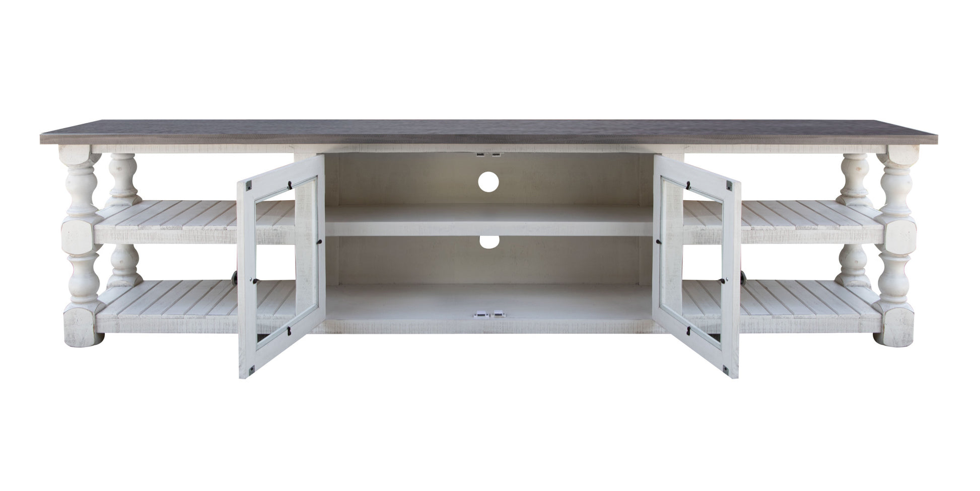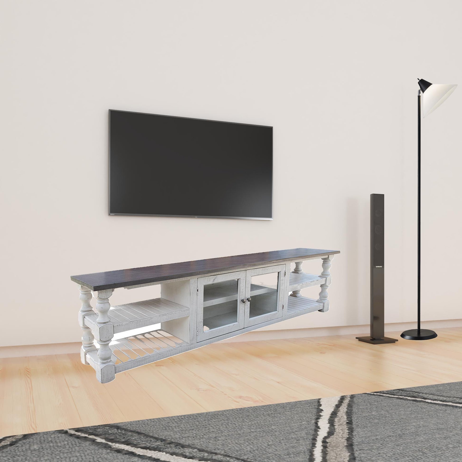 Practical, space saving, and good looking, this 93" gray and ivory solid wood cabinet enclosed storage distressed tv stand is a versatile media storage solution. Curated from high quality solid pine wood, this console is natural, beautiful, and built to last. Due to the genuine nature of the wood some natural wood knots, and grain and color variations may occur. I To add to the versatility, this piece features open non-concealed storage that can be used for not only storage but display as well. A cord cut out hole is ideal for wire and cable managment to keep your space looking tidy. Ideal for tv placement and storage in your living room, bedroom or office. 27" H x 92.5" W x 15.75" D