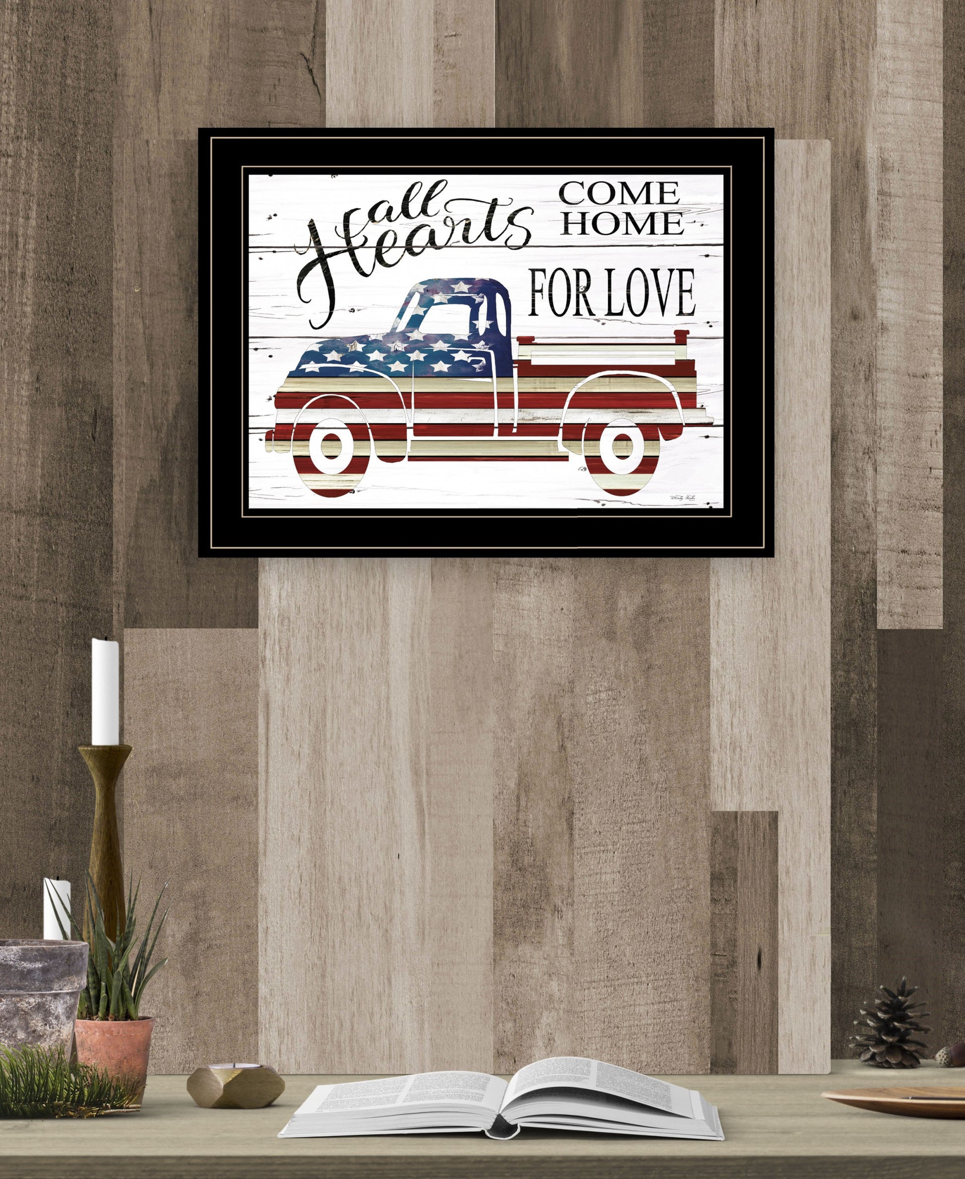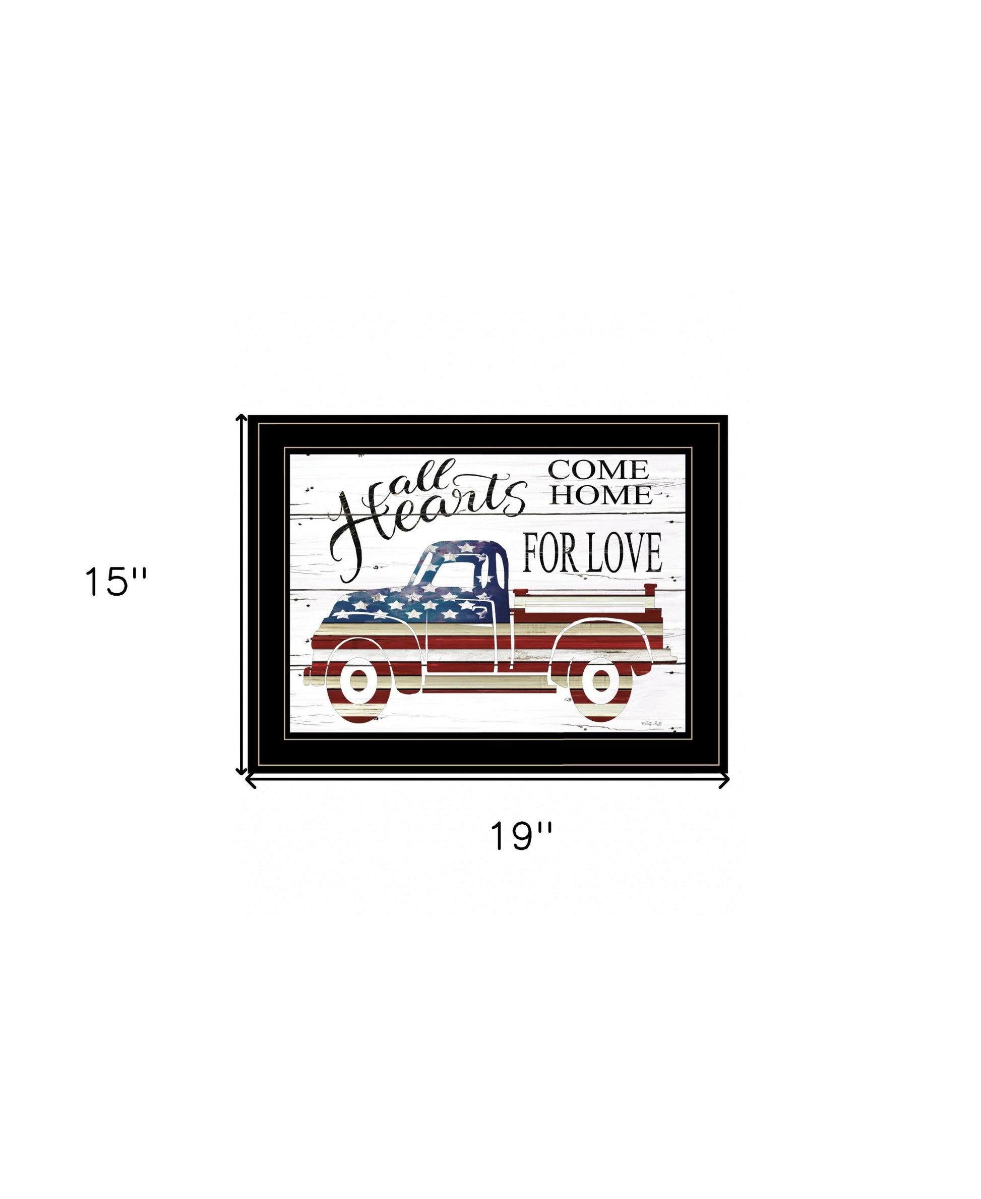 The all hearts come home for love truck 3 black framed print wall art is the perfect decorative accessory for your home. This print is a visual artistic expression that allows you to decorate your space in style. Reproduced for you on wood, this hanging decorative accent will be a trendy and fashionable way to dress your walls in a rustic and modern farmhouse vibe. Adding this hanging wall art to your space to make your room feel more finished and attractive. Utilize this opportunity to create a focal point in the room with this fabulous wall decor option. 15 inches H x 19 inches W x 1 inches D