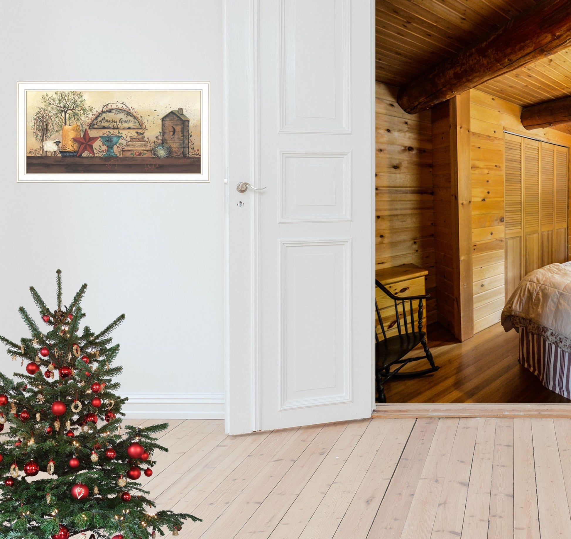 Unique and decorative, this amazing grace shelf 1 white framed print wall art will leave a lasting impression. This print is a visual artistic expression that allows you to decorate your space in style. Reproduced for you on paper, this hanging decorative accent will be a trendy and fashionable way to dress your walls. Adding this hanging wall art to your space to make your room feel more finished and attractive. Instantly liven up your space with this art that brings color and dimension to your walls. 19 inches H x 37 inches W x 1 inches D