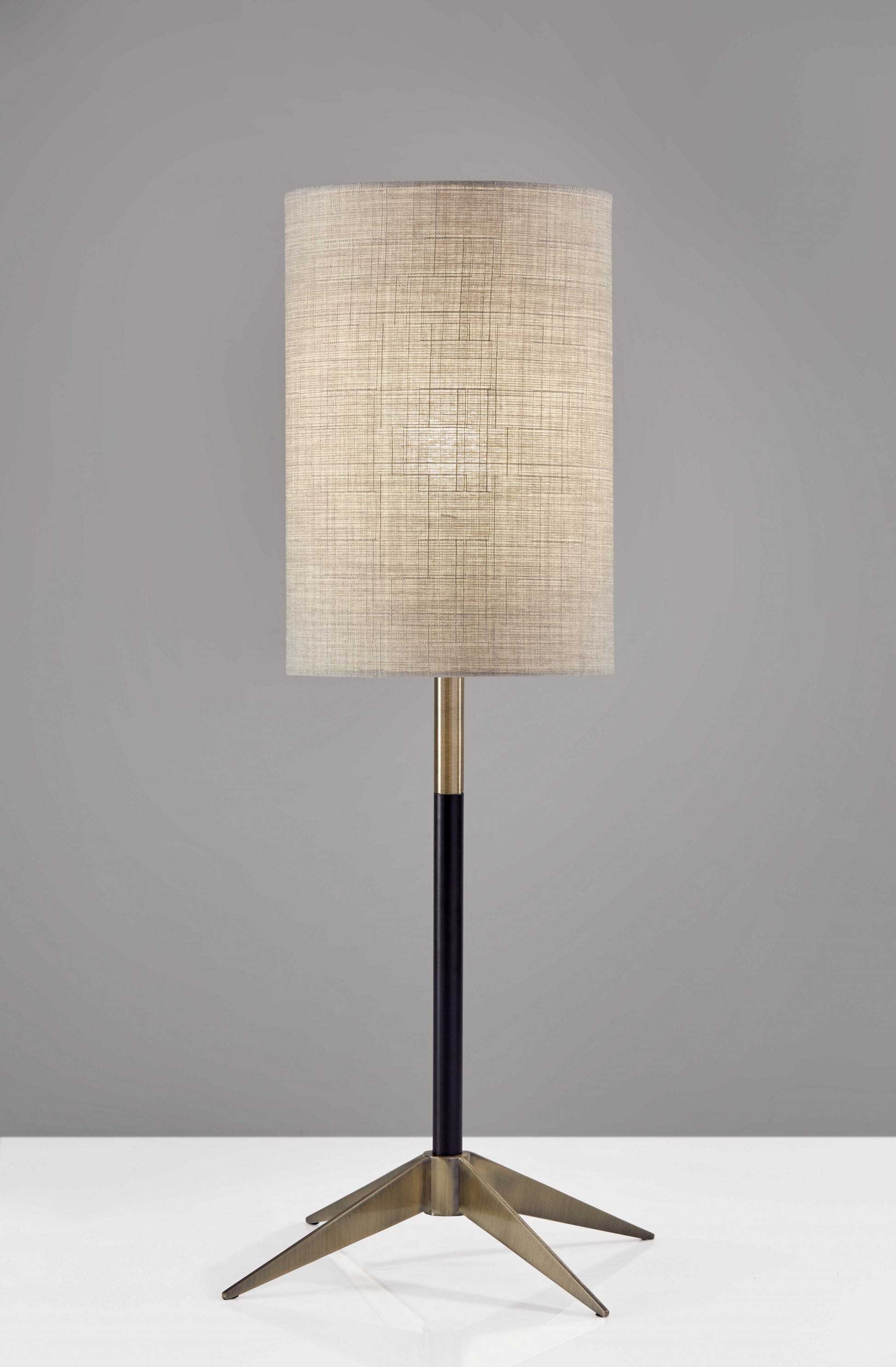 Mid-century modern influence is evident in this Table Lamp. A mix of matte black and antique brass finishes comprise the body of the lamp. A tall cylinder-shaped natural textured fabric shade softens the look. Perfect for the bedside, turn on and off by a simple rotary socket switch. A subtle clear cord comes neatly out of the bottom of the base.
