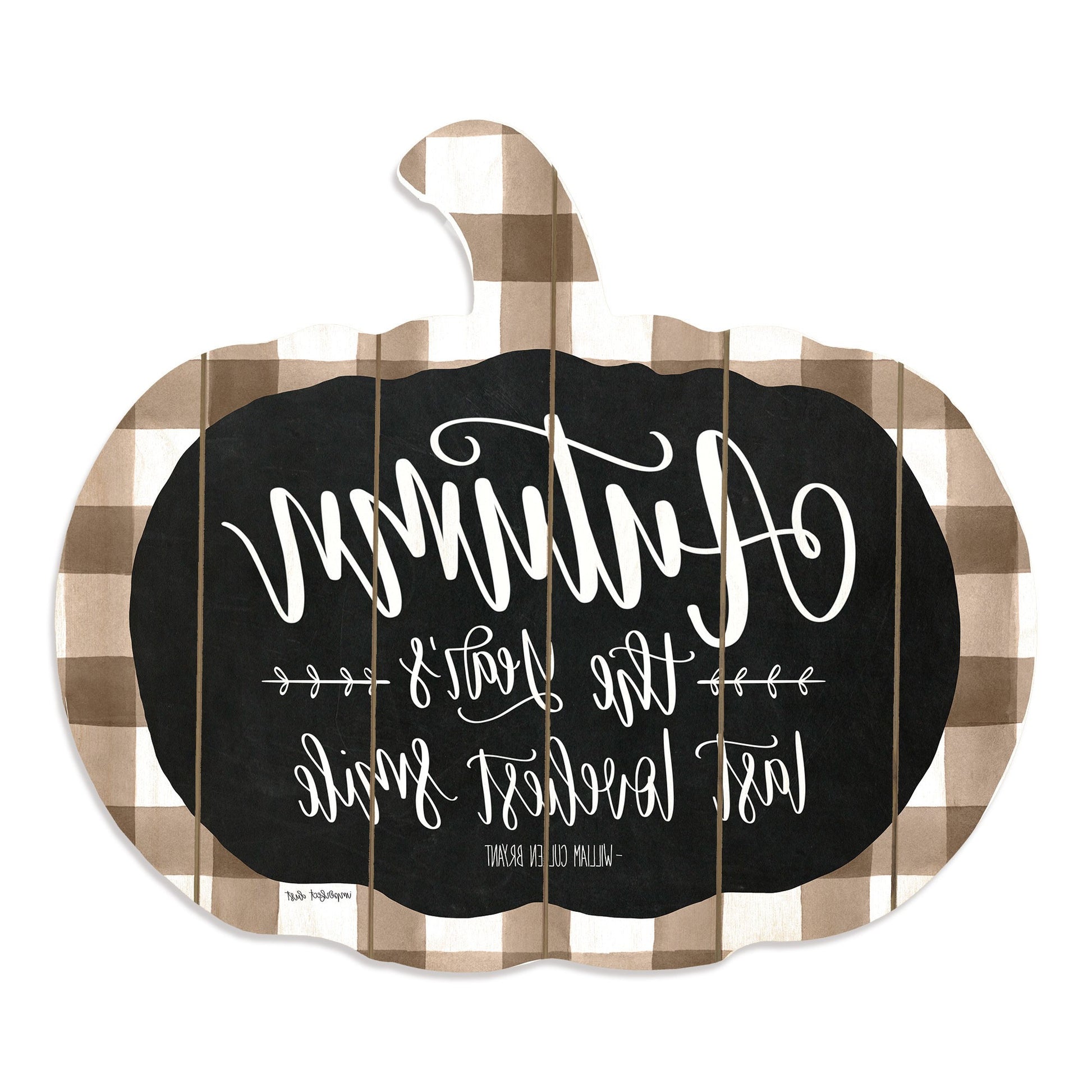 The autumn the years last loveliest smile pumpkin shape wall art is the perfect decorative accessory for your home. This unique and novel shaped art will bring some dimension and artistic design to your wall. This print is a visual artistic expression that allows you to decorate your space in style. Reproduced for you on wood, this hanging decorative accent will be a trendy and fashionable way to dress your walls in a rustic and modern farmhouse vibe. Hang on your wall to add some up to date fashion and decoration. Utilize this opportunity to create a focal point in the room with this fabulous wall decor option. 15 inches H x 17.25 inches W x 1 inches D
