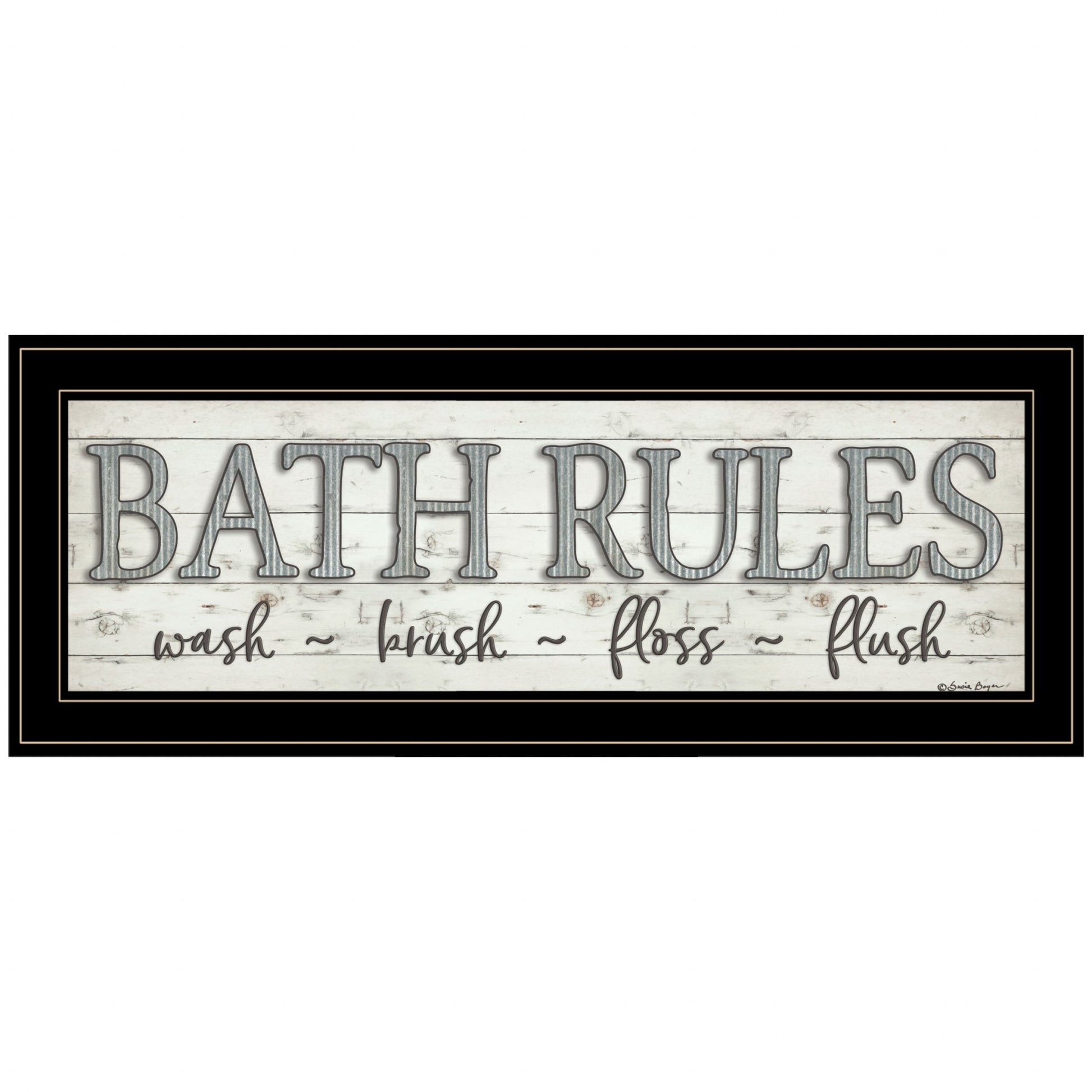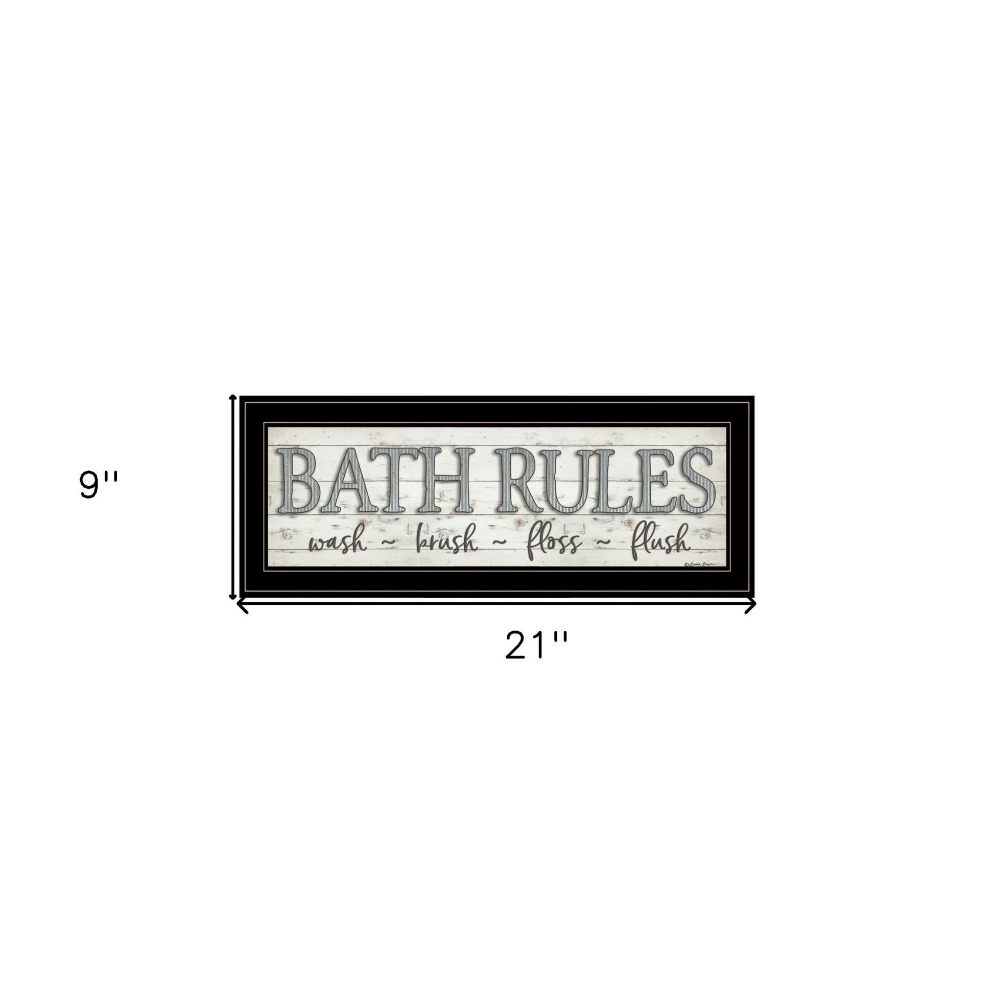 Unique and decorative, this bath rules 2 black framed print wall art will leave a lasting impression. This print is a visual artistic expression that allows you to decorate your space in style. Reproduced for you on paper, this hanging decorative accent will be a trendy and fashionable way to dress your walls. Adding this hanging wall art to your space to make your room feel more finished and attractive. Instantly liven up your space with this art that brings color and dimension to your walls. 9 inches H x 21 inches W x 1 inches D