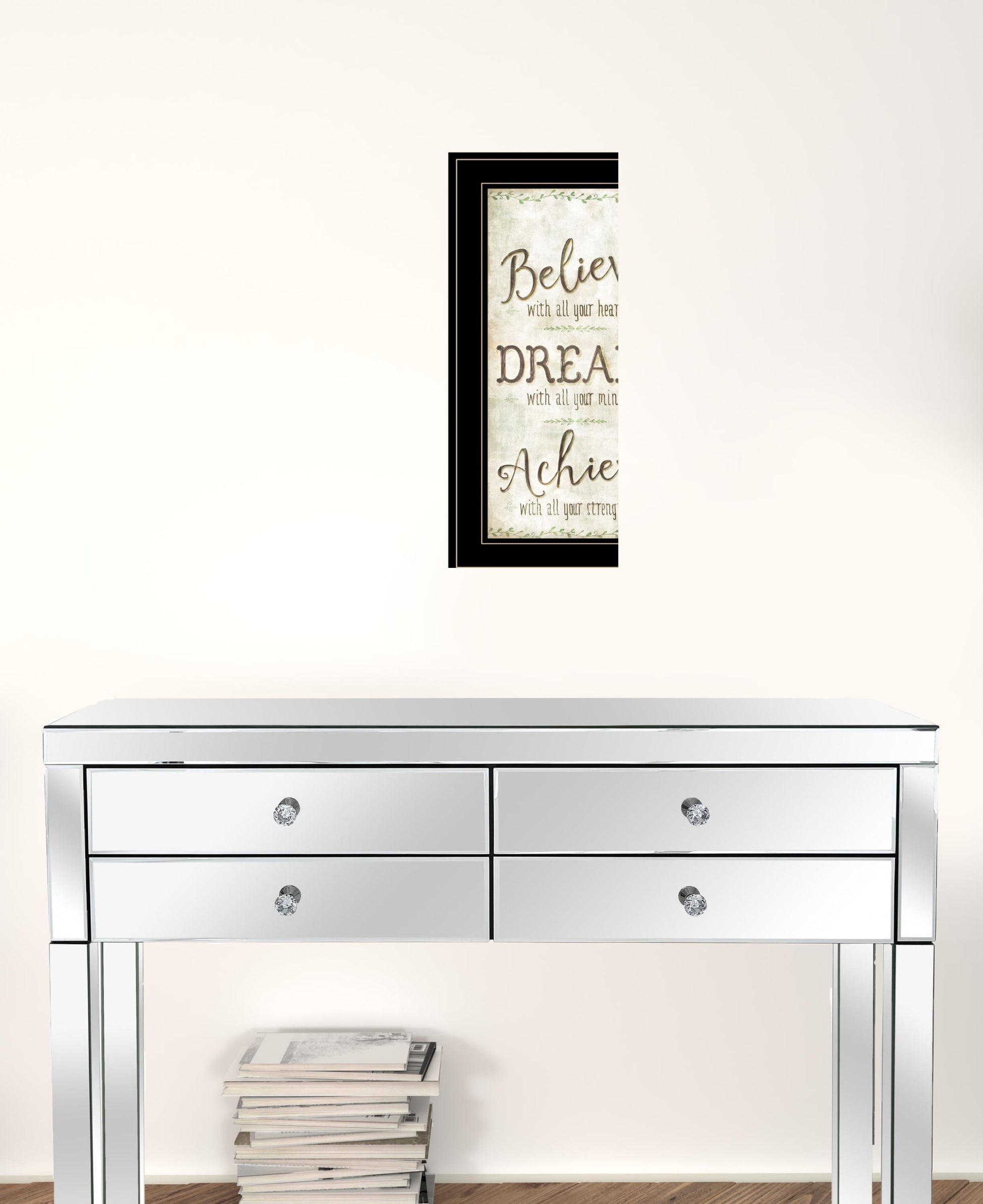 Unique and decorative, this believe 3 black framed print wall art will leave a lasting impression. This print is a visual artistic expression that allows you to decorate your space in style. Reproduced for you on paper, this hanging decorative accent will be a trendy and fashionable way to dress your walls. Hang on your wall to add some up to date fashion and decoration. Utilize this opportunity to create a focal point in the room with this fabulous wall decor option. 21 inches H x 12 inches W x 1 inches D