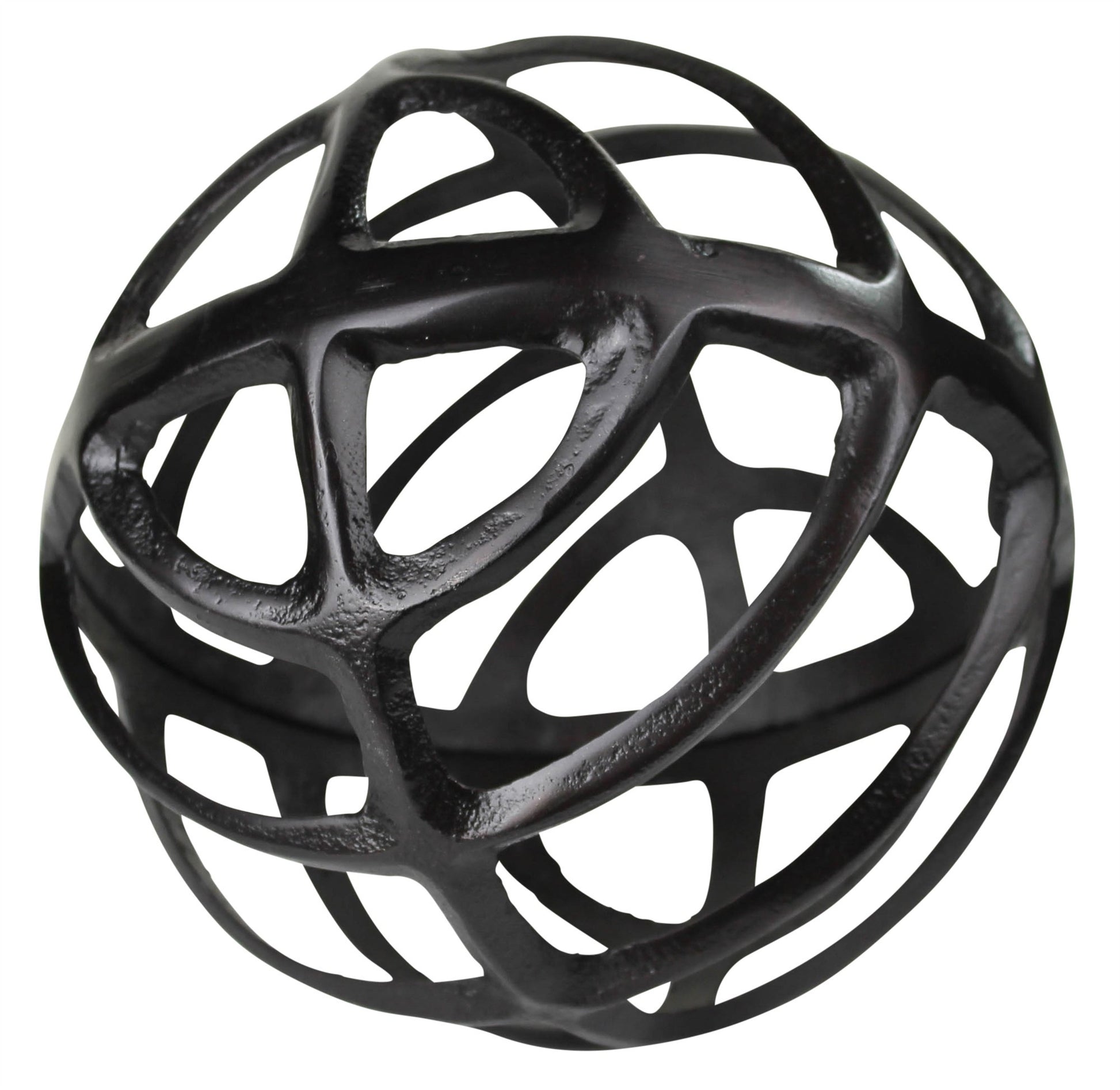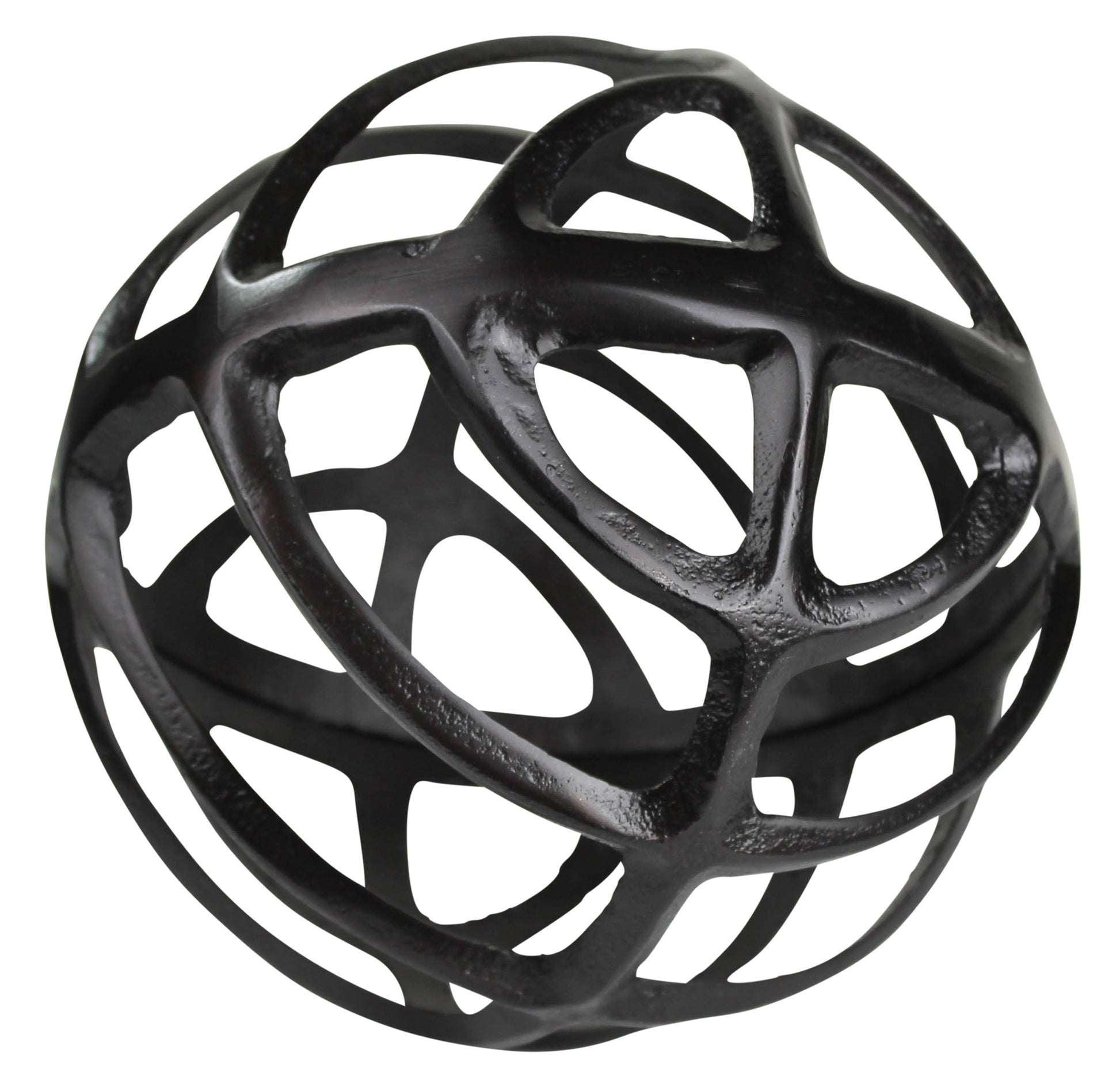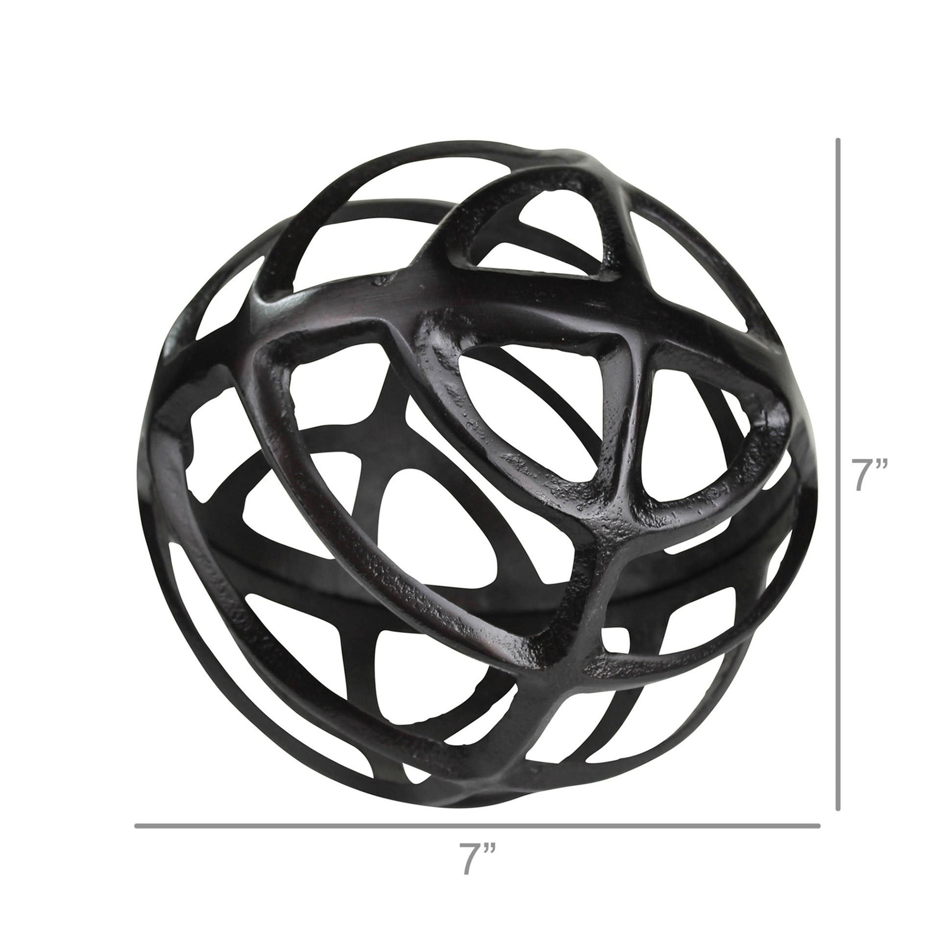 Add a touch of contemporary design to your home with this Black Metal Geometric Sphere. This piece is made from metal and has a circular orb shape to it. The general circular shape is made up of different metal rods are that intersecting at different points. The open nature of this piece gives it a very airy feel while the black finish on top makes it look more formal. You can use this unique decor piece anywhere in your home and it will look great owing to its neutral colorway and minimal design. You can group it up with other decor pieces or use it as a stand-alone piece. 7" H x 7" W x 7" D