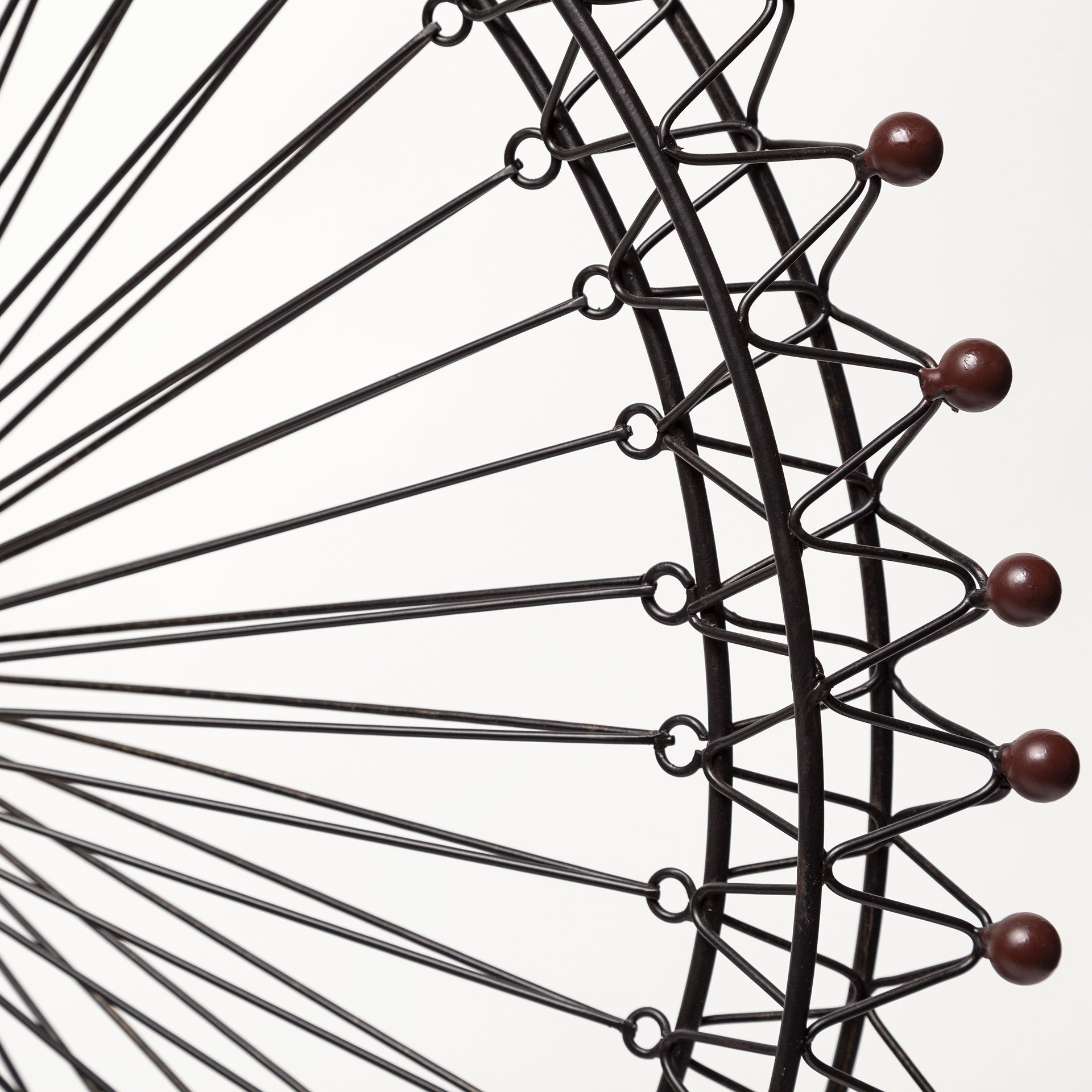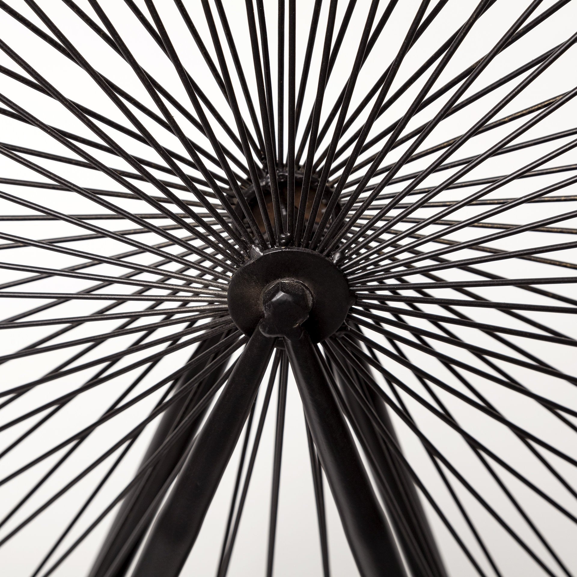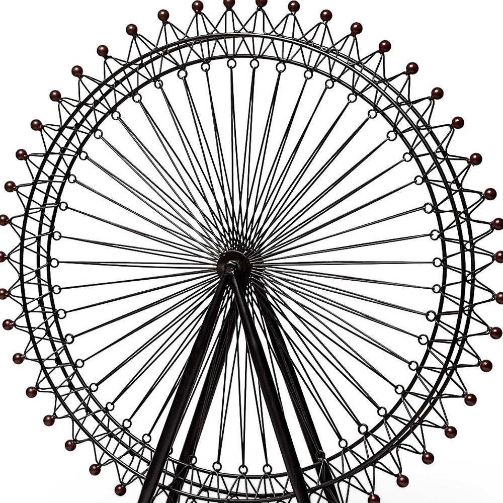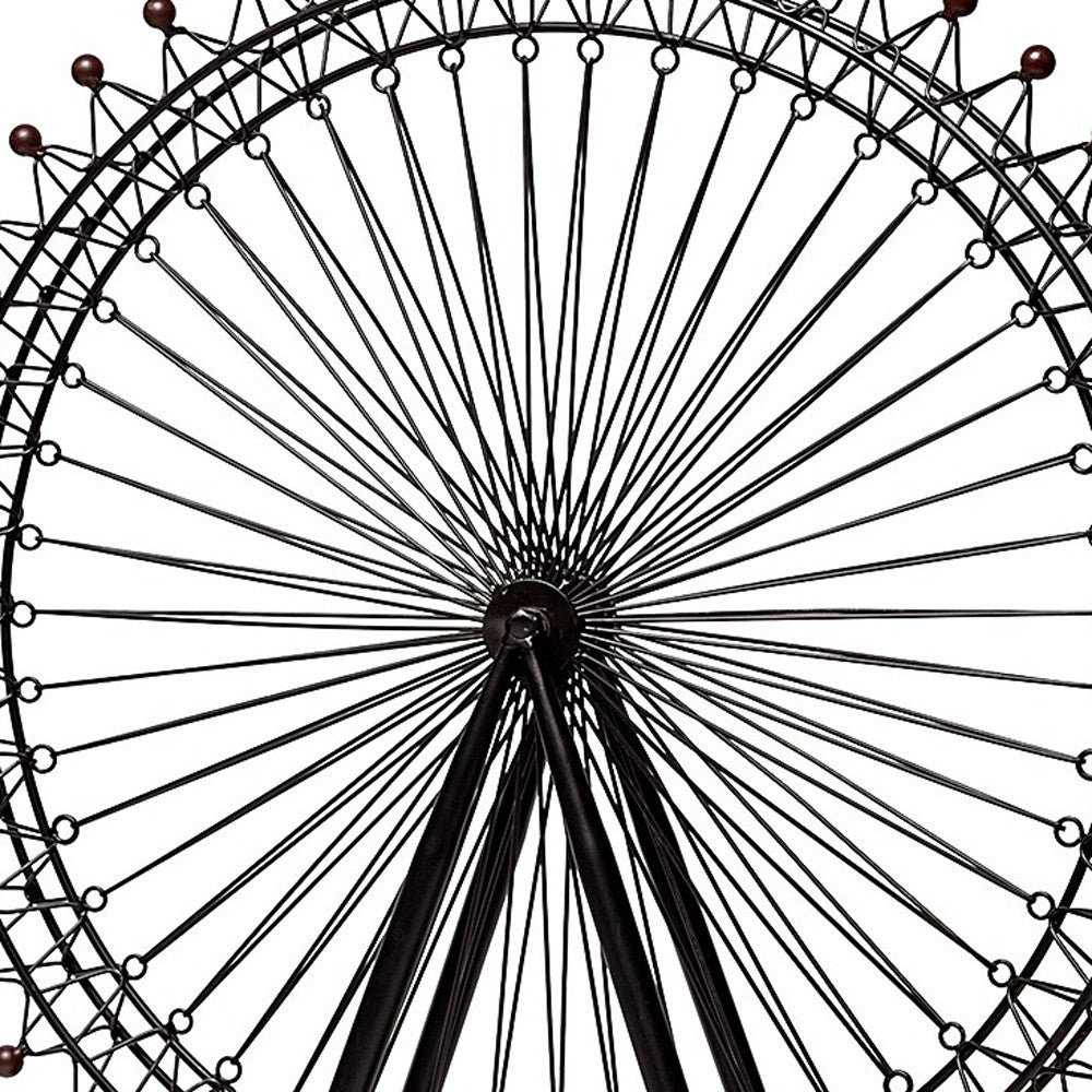 Bring a touch of culture mixed with contemporary design to your home with this Black Metal London Eye Sculpture. This decor is made from solid metal and has a very stunning matte black finish on it. There is a rectangular block that serves as the base on which there are four metal rods attached in the same color. The four metal rods come together at the central point of the london eye shape that fans out across this whole decor piece. The london eye shape has a thin wire design which makes it look very elegant. You can use this decor piece anywhere in your home owing to its neutral colorway. This piece is very unique and whimsical but can be used as part of formal decor as well, whether that be in the living room or in the study area. 27" H x 25" W x 3" D