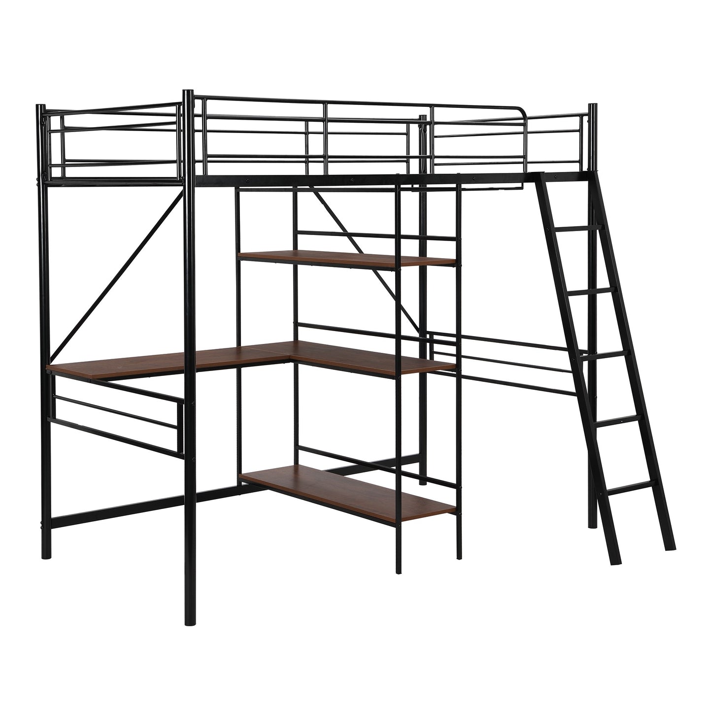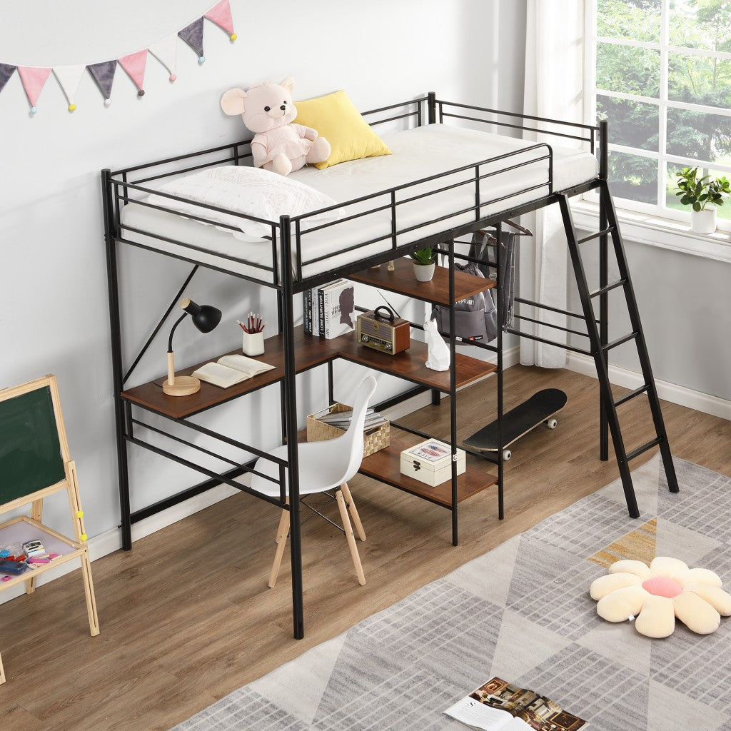 Black Twin Size Metal Loft Bed With Desk and Shelves