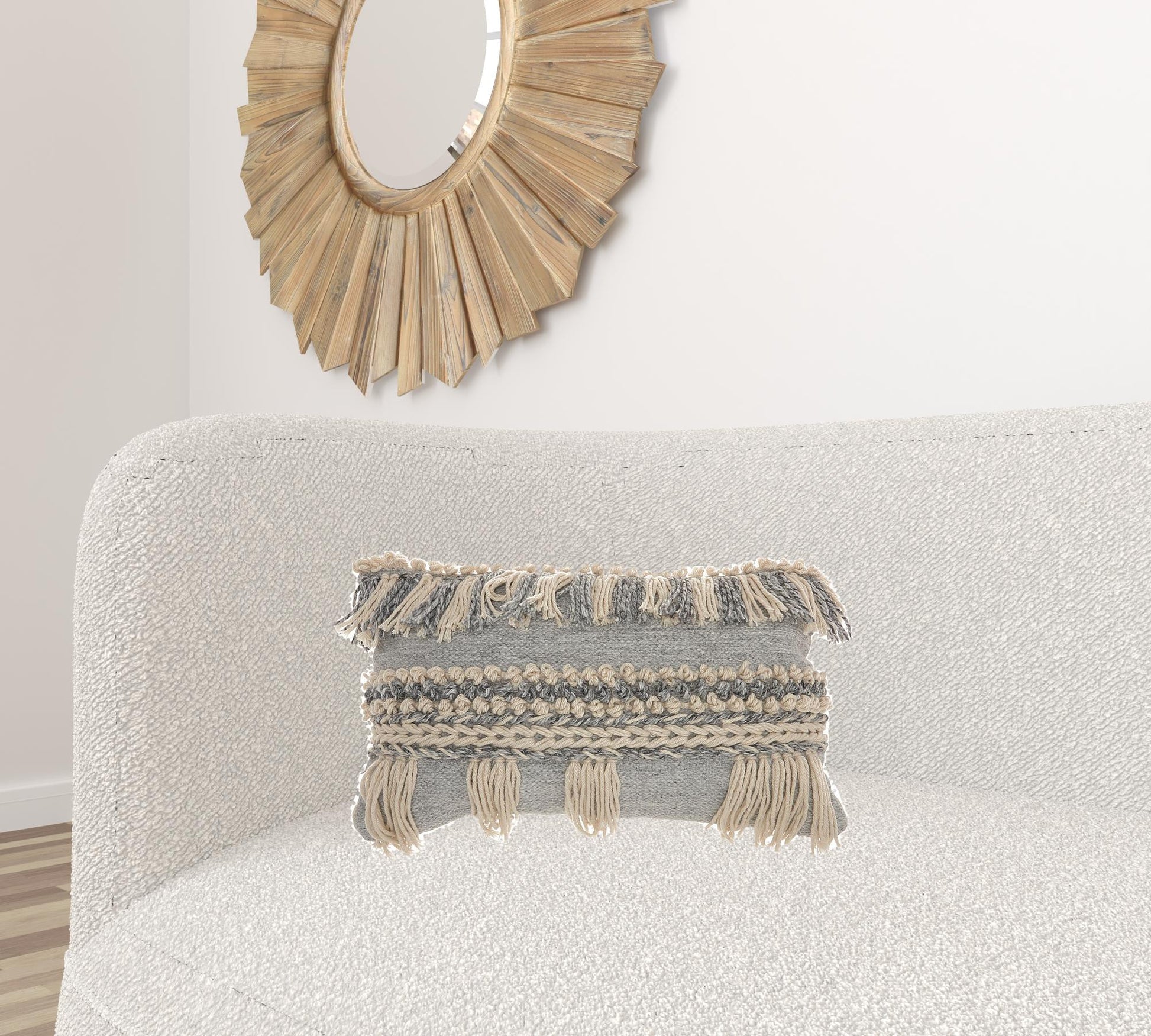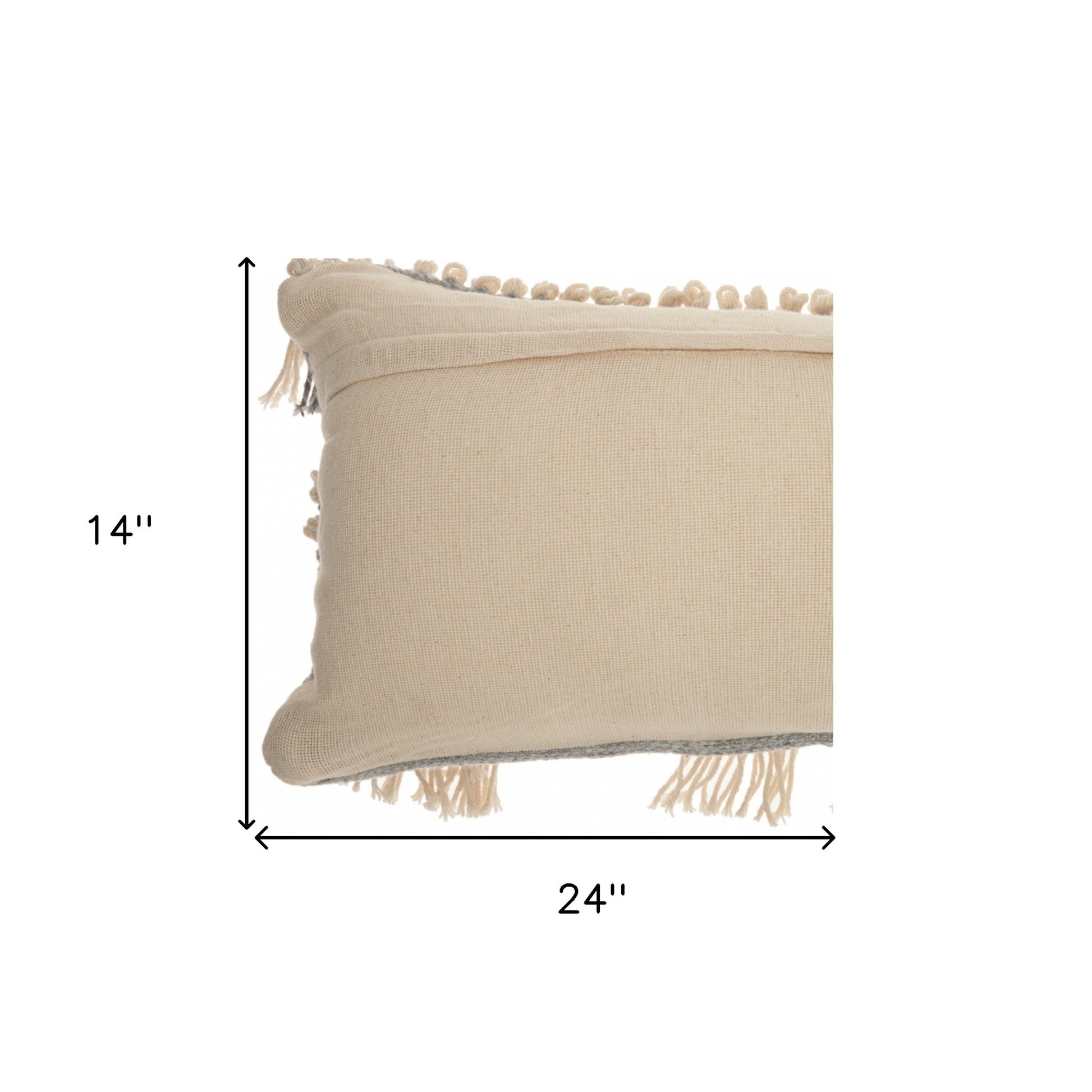 This Blue and Cream Macramé Lumbar Pillow will be the perfect way to add some design to any seating space in your home. This pillow has a rectangular shape and is covered in a textured macramé fabric. The fabric has a blue colored background on top which there blue and cream colored details. The top has tassels attached from the edge after which there is a plain blue stripe. The middle has round thread details and braided stripes which have spaced out cream colored thread tassels hanging from them. This lumbar pillow has a lot of textures on it all of which give it a unique look. You can use this pillow on your bed, your couch, or any chair in your home to elevate the whole space and add a pop of bohemian style. 5" H x 14" W x 24" D