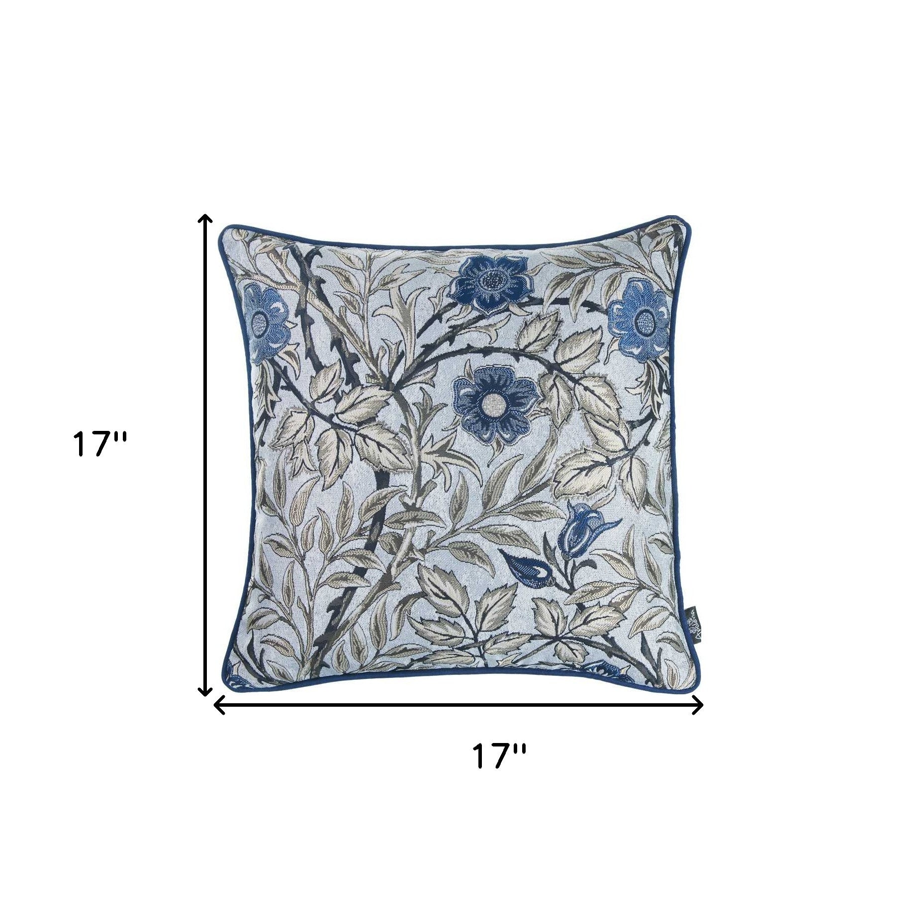Easily update and refresh your home with this luxurious and beautiful blue and beige jacquard leaf decorative throw pillow cover. The binding around the edges gives a luxurious feel and distinctive look while the hidden zipper closure provides a clean and seamless look all the way around. Made of 100% Polyester jacquard this beautiful pillow also has a luxurious hand. 17" X 17". Machine wash cold separately, gently cycle only, no bleach, tumble dry low, do not Iron, medium, and from the reverse side