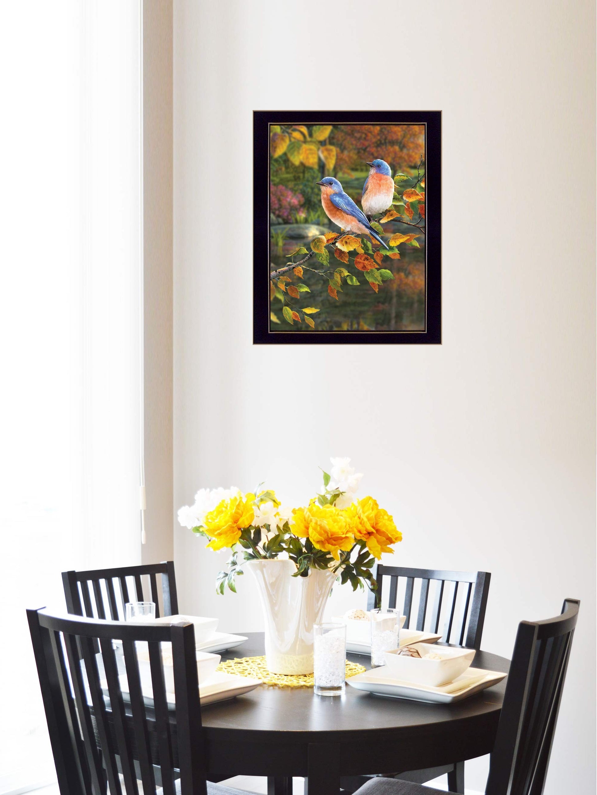 Bring some sizzle to your space with this eye-catching bluebirds 1 black framed print wall art. This print is a visual artistic expression that allows you to decorate your space in style. Reproduced for you on paper, this hanging decorative accent will be a trendy and fashionable way to dress your walls. Hang on your wall to add some up to date fashion and decoration. Utilize this opportunity to create a focal point in the room with this fabulous wall decor option. 18 inches H x 14 inches W x 1 inches D