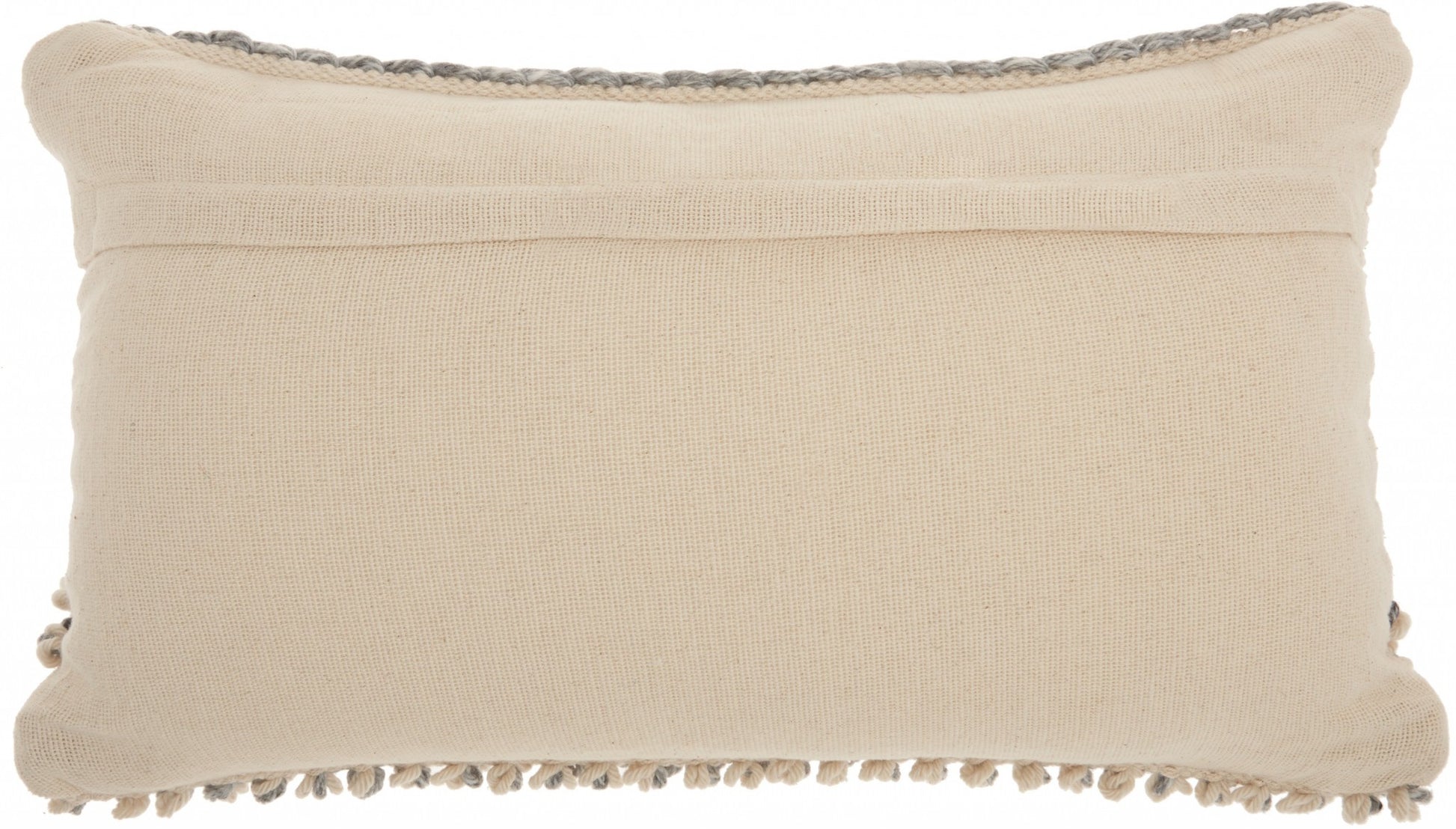 With this Bohemian Blue and White Lumbar Pillow you can add the perfect touch of design and comfort to your couch. This pillow has a rectangular shape and is covered in a macramé fabric that gives it a soft and textured look. The fabric has a blue and white colorway which means it will work with any existing colors or decor style you may have in your home. There is a geometric block pattern on the top half of this cover while the bottom has a dashed design. The bottom edge has small thread tassels in the same blue and white colorway and finishes the look of this pillow perfectly. Use this lumbar pillow on your couch, on your bed, or on any chair to elevate the look. 5" H x 14" W x 24" D