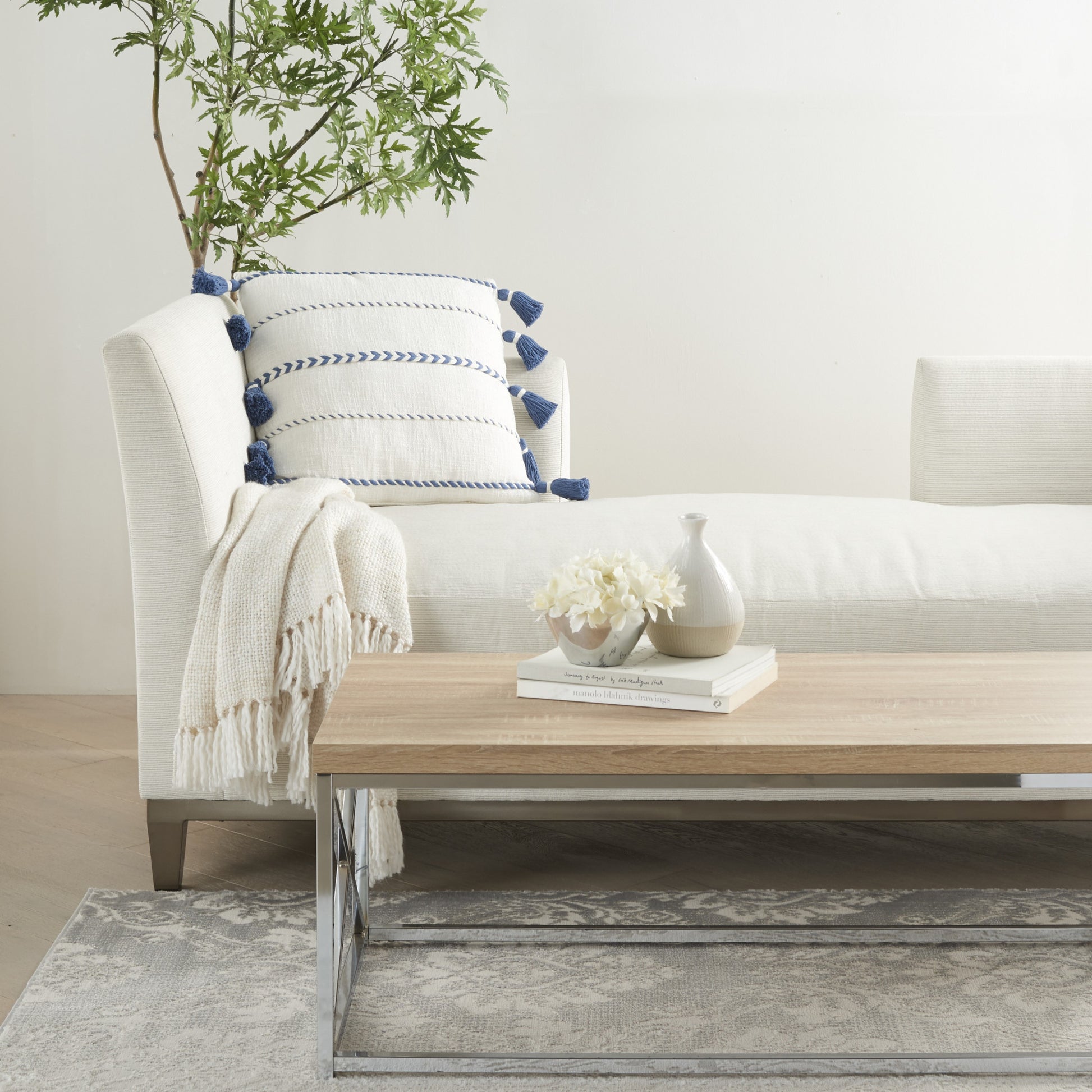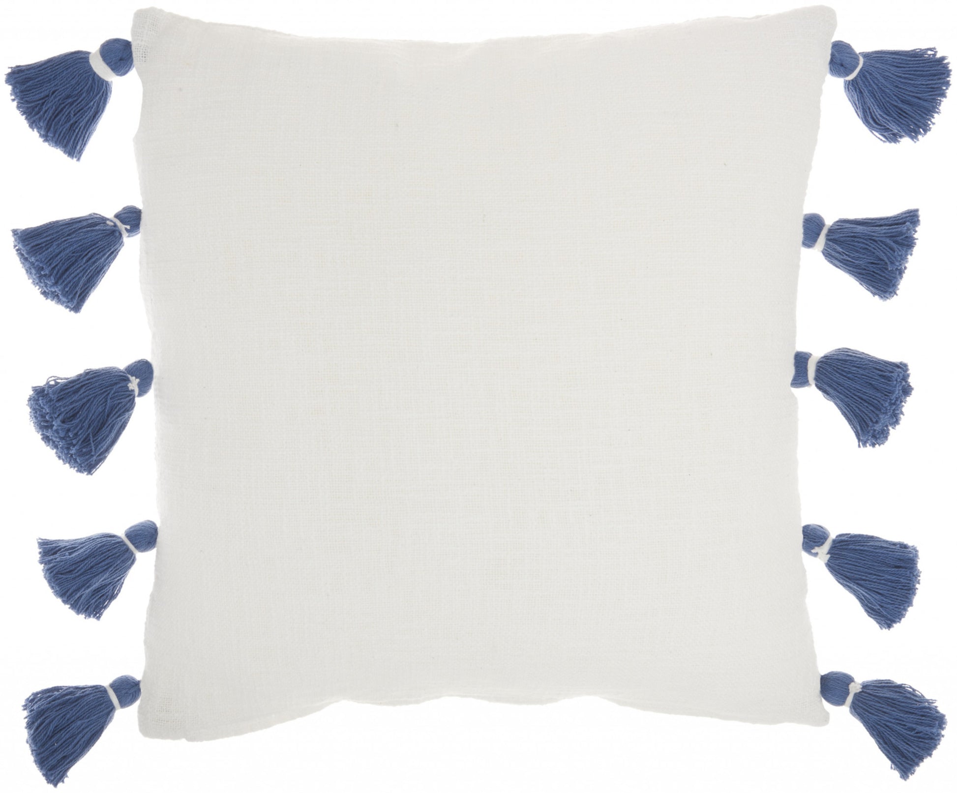 Contemporary and quirky, this Bohemian White Cotton Accent Pillow with Blue Tassel Details will help bring a Boho-chic style to your interior by offering plush comfort and easy decorating. This throw pillow is expertly handcrafted, making it a unique item that is made with skill and professionalism. The added feature of a zipper closure makes for easy cleaning of the pillow case, allowing for easy care. The pretty blue tassels on the four corners and the blue textured braided trellis pattern woven into the front cover adds a great detail and uniqueness to the design and your future pillow setup! 5" x 20" x20"