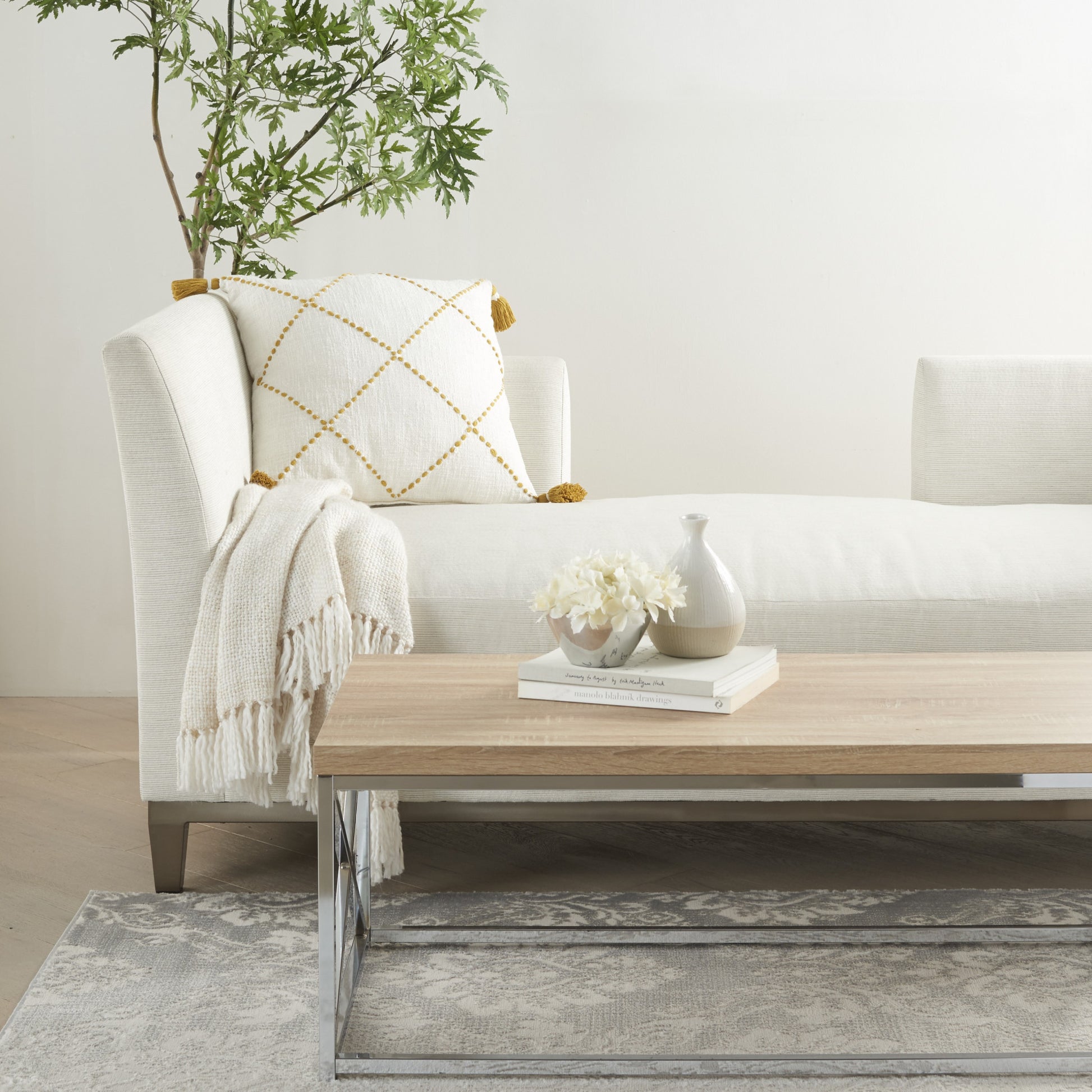 Contemporary and fun, this Boho Mustard Cotton Accent Throw Pillow will help bring a Bohemian, chic style to your interior by offering plush comfort and easy decorating. This throw pillow is expertly handcrafted, making it a unique item that is made with skill and professionalism. The added feature of a zipper closure makes for easy cleaning of the pillow case, allowing for easy care. The fun color of mustard yellow tassels on the corners and the mustard textured braided trellis pattern woven into the front cover adds a great detail and uniqueness to the design and your future pillow setup! 5" x 20" x20"