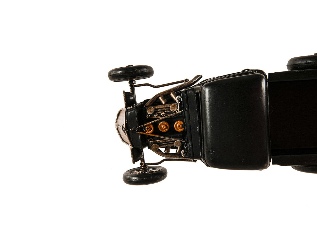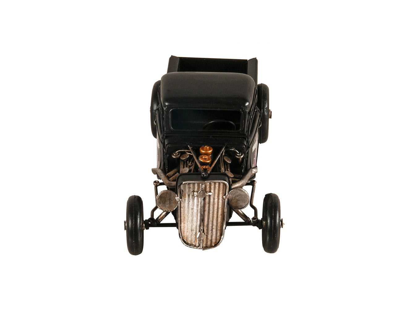 An authentic and jolly replica of the iconic of the '60s, the Bravado Rat-Truck Sculpture is a handmade model made of metal with a super cool "The Rat" logo on both doors. It features rolling spoke wheels, exhaust piping, headlights, a steering wheel, and a steering wheel. It is painted in authentic black with a naked engine. Perfect decoration piece for game rooms or dens. 5'' x 10.5'' x 5"