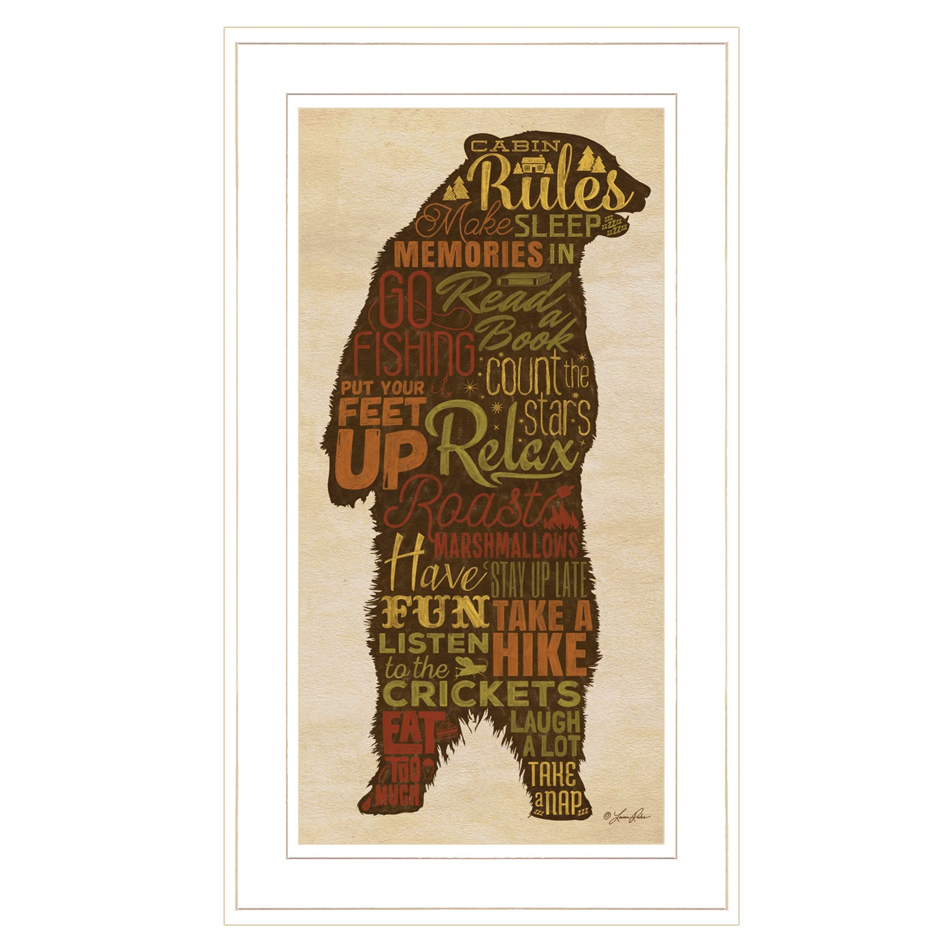 The cabin rules 3 white framed print wall art is the perfect decorative accessory for your home. This print is a visual artistic expression that allows you to decorate your space in style. Reproduced for you on paper, this hanging decorative accent will be a trendy and fashionable way to dress your walls. Adding this hanging wall art to your space to make your room feel more finished and attractive. Instantly liven up your space with this art that brings color and dimension to your walls. 21 inches H x 12 inches W x 1 inches D