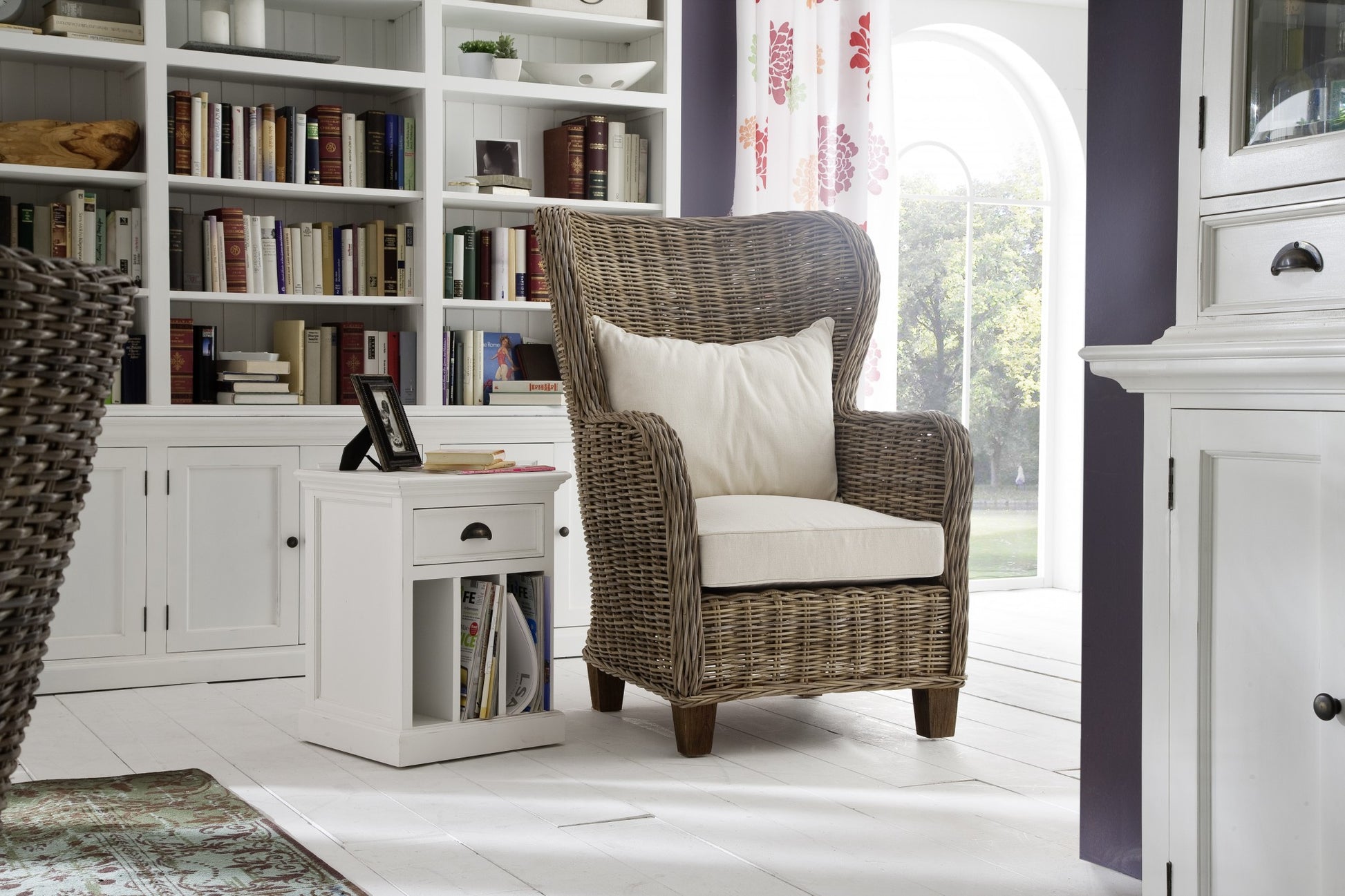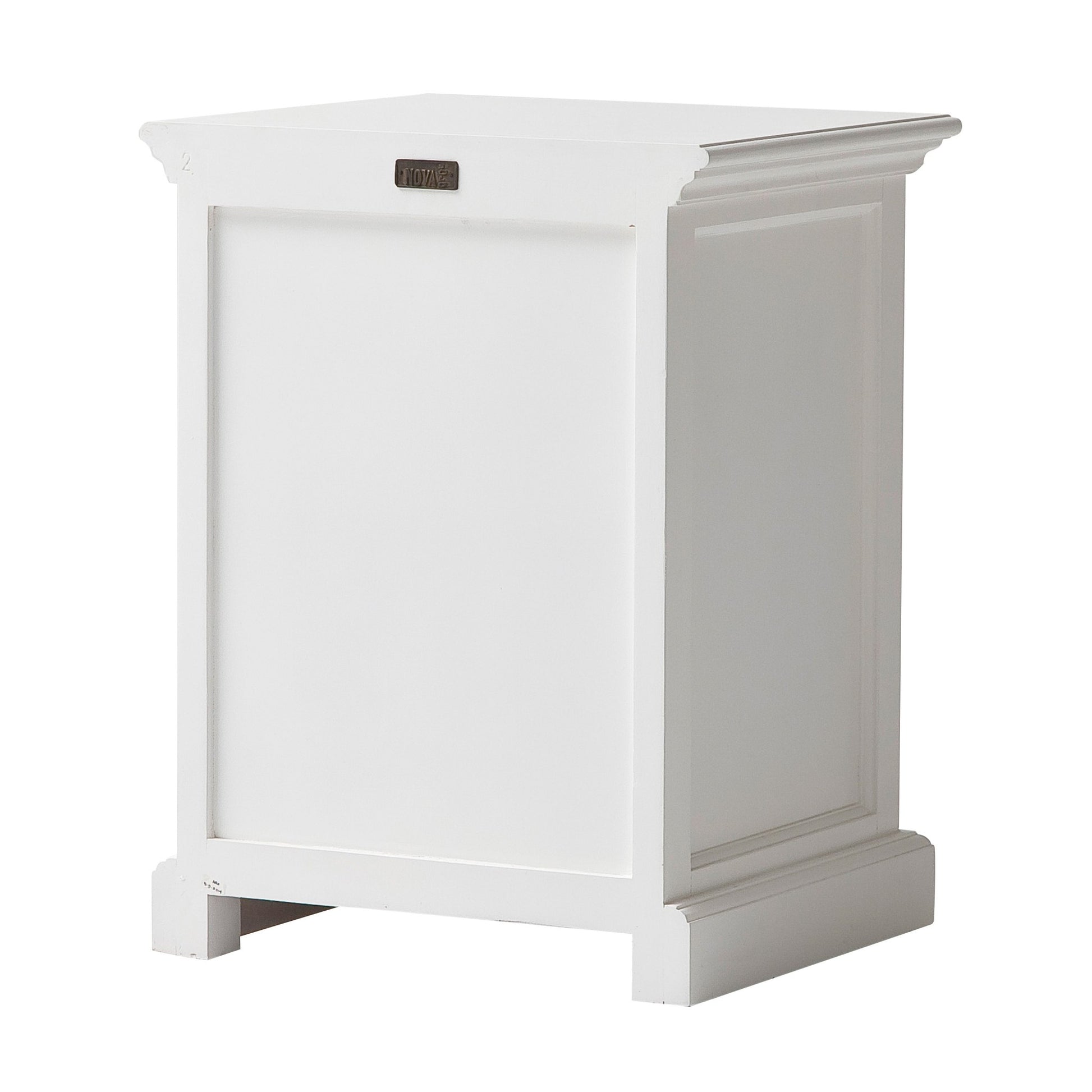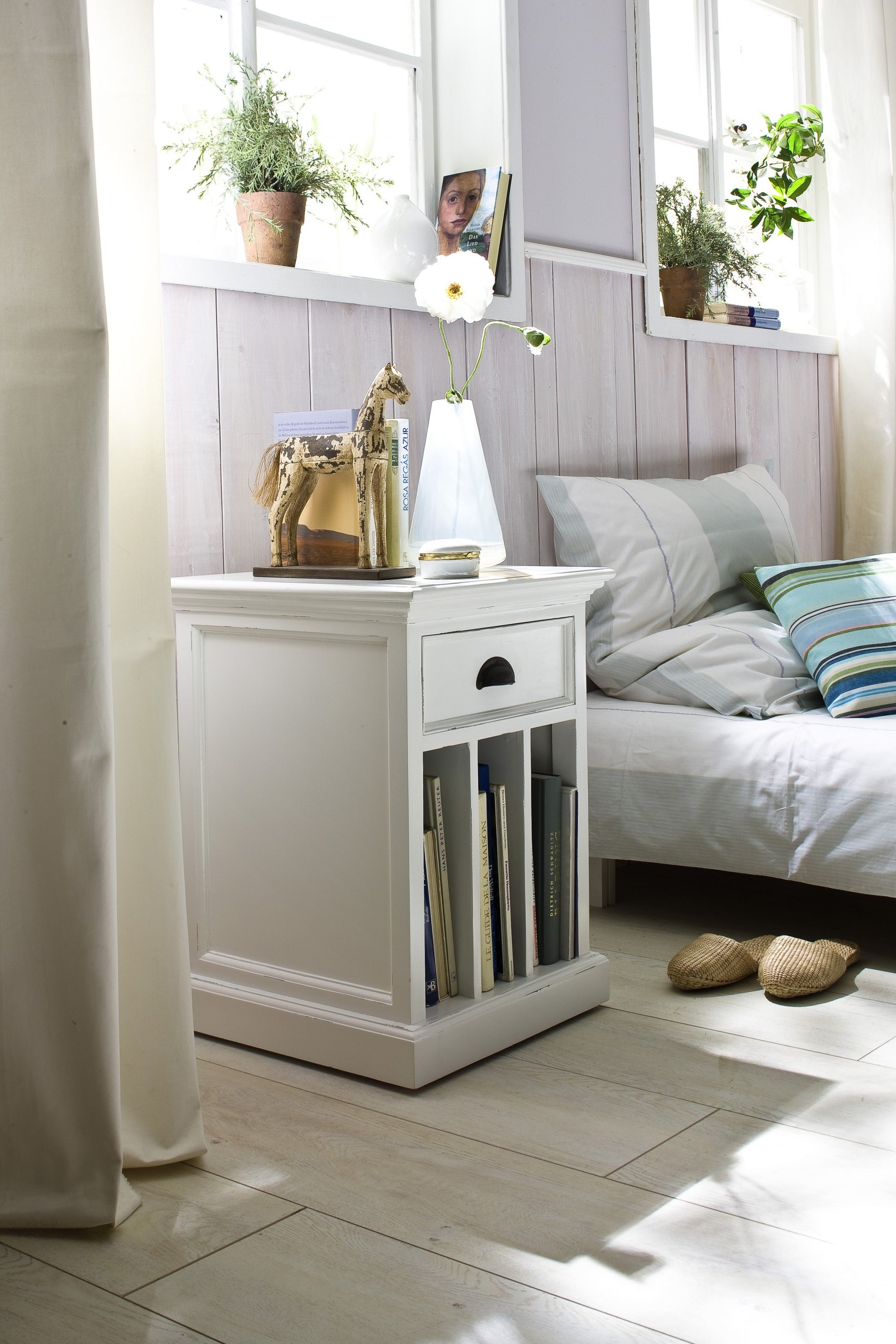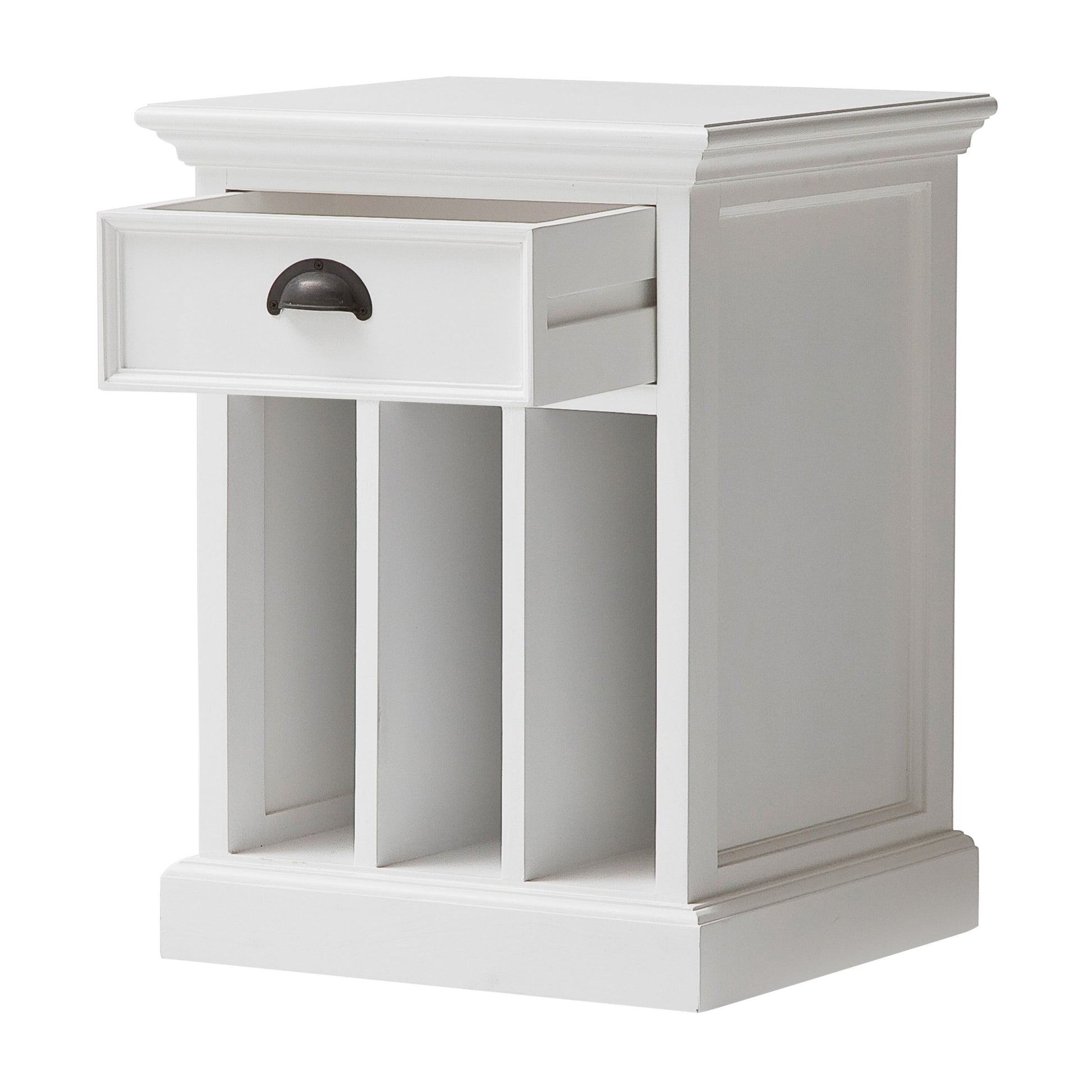 Enrich your home with this perfect alternative to the traditional shelving system, the Classic White Nightstand With Dividers is an ideal combination of strength an style. Robust in design, the table is handcrafted from kiln dried solid mahogany wood with a semi-glossy white paint finish. Owing to it's significant presence, this bedside charmer is incorporated with a single drawer and three vertical upright dividers for ample storage. This versatile space can accommodate your favorite large photo albums or books of varied sizes. Crown molding features are found on the frame of the drawer and the table edges. Antique brass hardware cup handles adorn the drawer for easy and smooth access. On the whole, it is the perfect table to enhance your vintage decor and serve as an additional storage companion in your bedroom. 23.62" x 17.72" x 16.93"