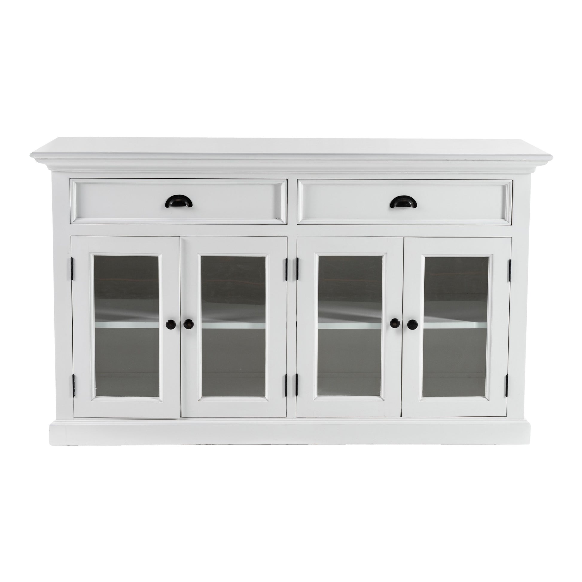 Traditional in style the Classic White Small Buffet Table adds a hint of contemporary when paired with any modern cum vintage decor. Crafted from mahogany wood with an all white finish, the buffet comprises of two doors with antique brass knobs that open to reveal four equally aligned shelves topped with two drawers with antique brass cup pull handles. The buffet provides ample storage space for all your dinnerware, linens, silverware along with a wide surface area to serve your favorite dishes. Owing to its color, the buffet can be easily combined with other warm-hued furniture pieces to complete that all natural unique theme. Beveled glass doors contrasts the luminous backdrop of the buffet allowing the various hues of your dinnerware to shine through. Refine your decor with this practical and captivating buffet table. 33.46" x 57.09" x 19.69"