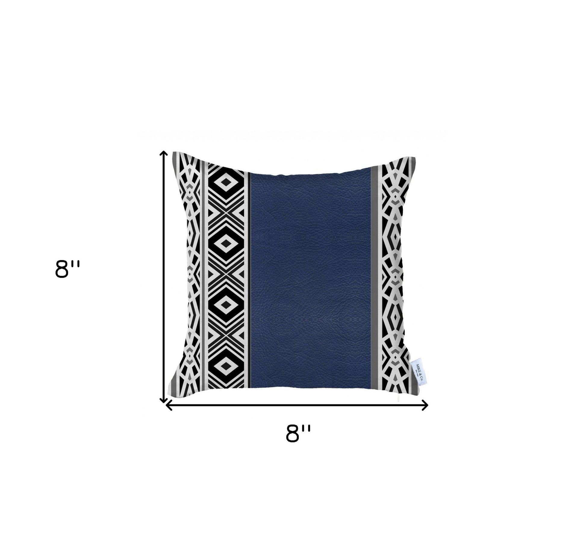 Induce a countryside feel to your living space with this uniquely designed Deep Navy Faux Leather Geometric Throw Pillow. With a base of geometric patterns in charcoal black and daisy white, the deep navy faux leather in the middle intensifies the Bohemian essence. Crafted in Turkey with high-quality 100% polyester material to ensure long-lasting durability and color intensity. The fabric is OEKO-TEX standard 100 certified, which speaks for its quality and product safety. This pillow comes with soft poly filling for a comfortable feel while the hidden zipper closure provides a clean and seamless finish around the edges to complete the look. Place this comfortable square pillow anywhere in your home and it will blend in with the décor adding more depth to your room. 18” x 18” x 1”