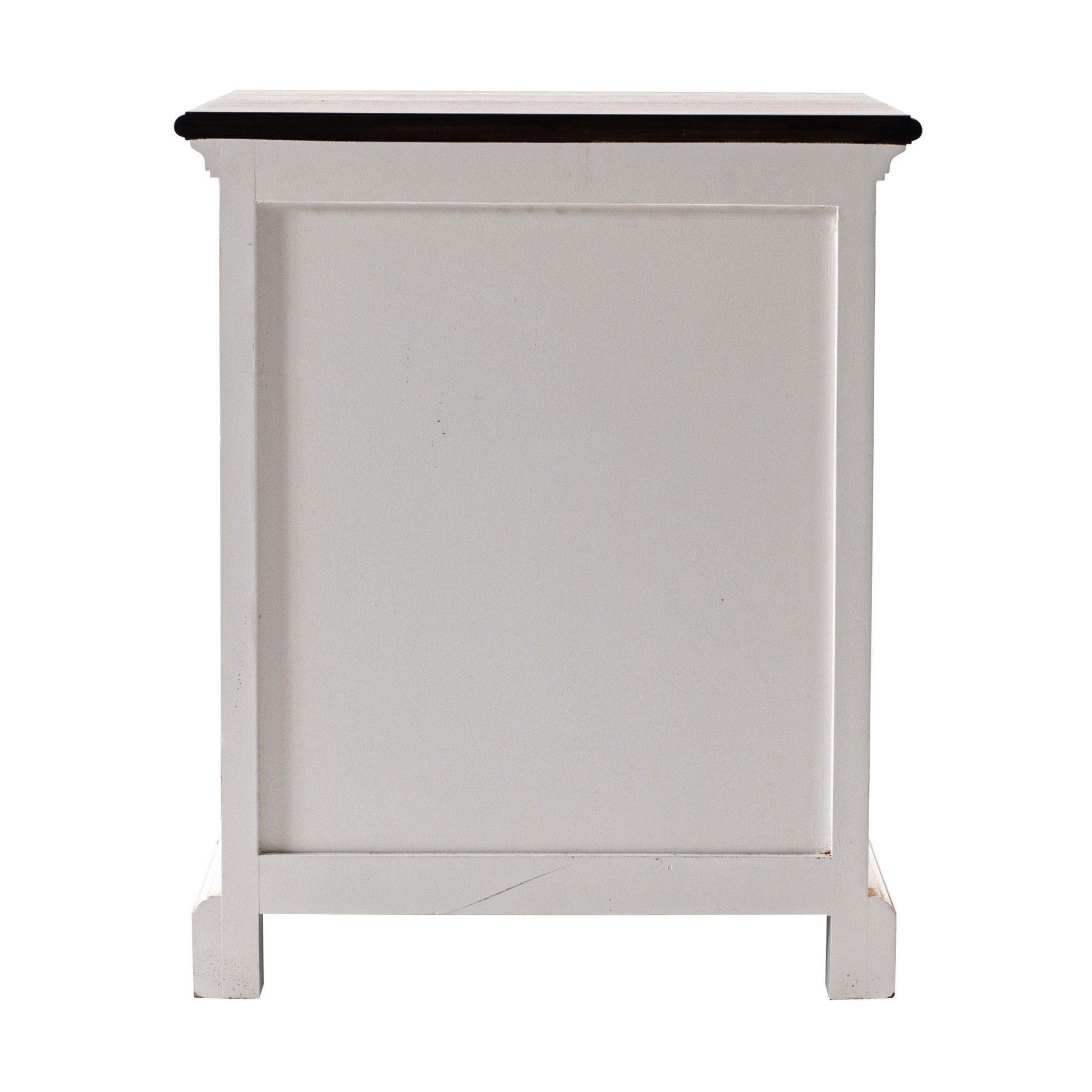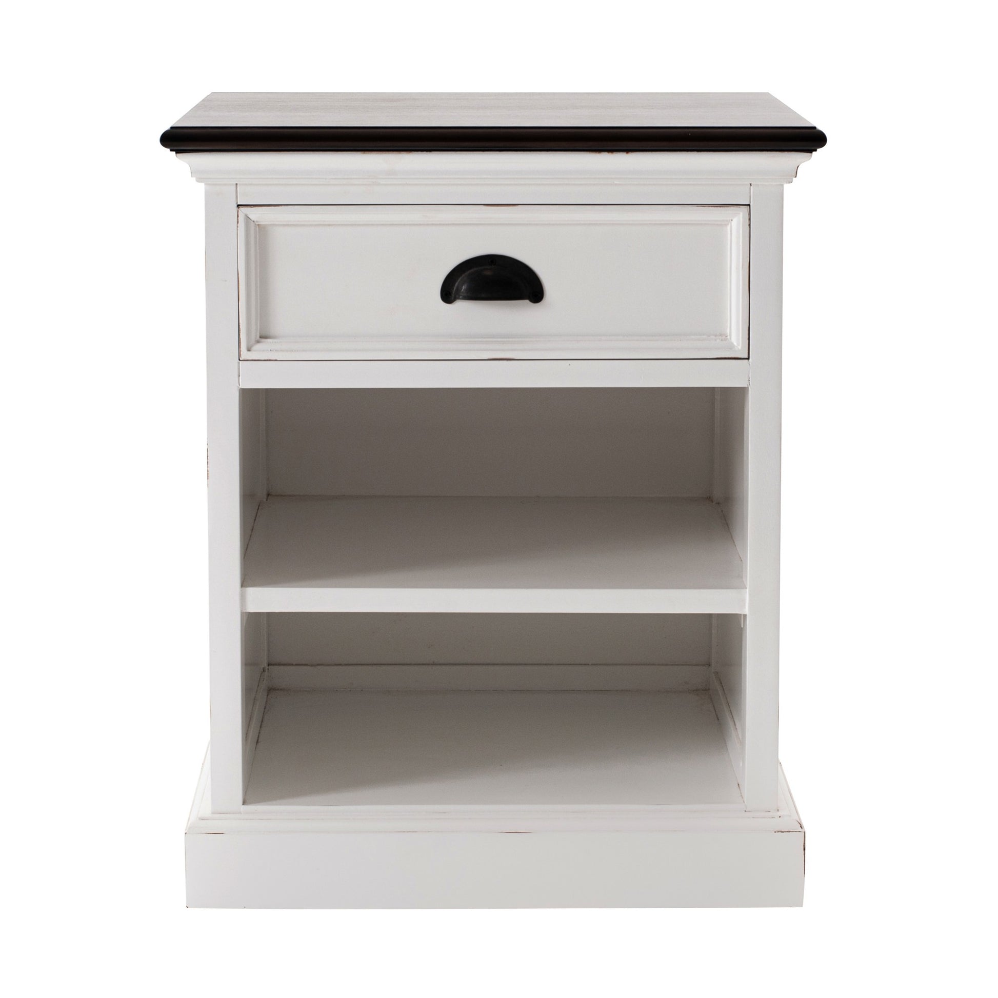 A perfect combination of strength and style, the Distressed White and Deep Brown Nightstnad With Shelves will surely enrich your home. Robust in design, the table is handcrafted from kiln dried solid mahogany wood with a combination of distressed white paint and deep brown finish. Owing to it's significant presence, this bedside charmer is incorporated with a single drawer and two open shelves for ample storage. Crown molding features are detected on the frame of the drawer and the table edges. Antique brass hardware cup handles adorn the drawer for easy and smooth access. On the whole, this beautiful brown and white contrasting table is ideal to enhance your vintage decor and serve as an additional storage companion in your bedroom. 23.62" x 17.72" x 16.93"