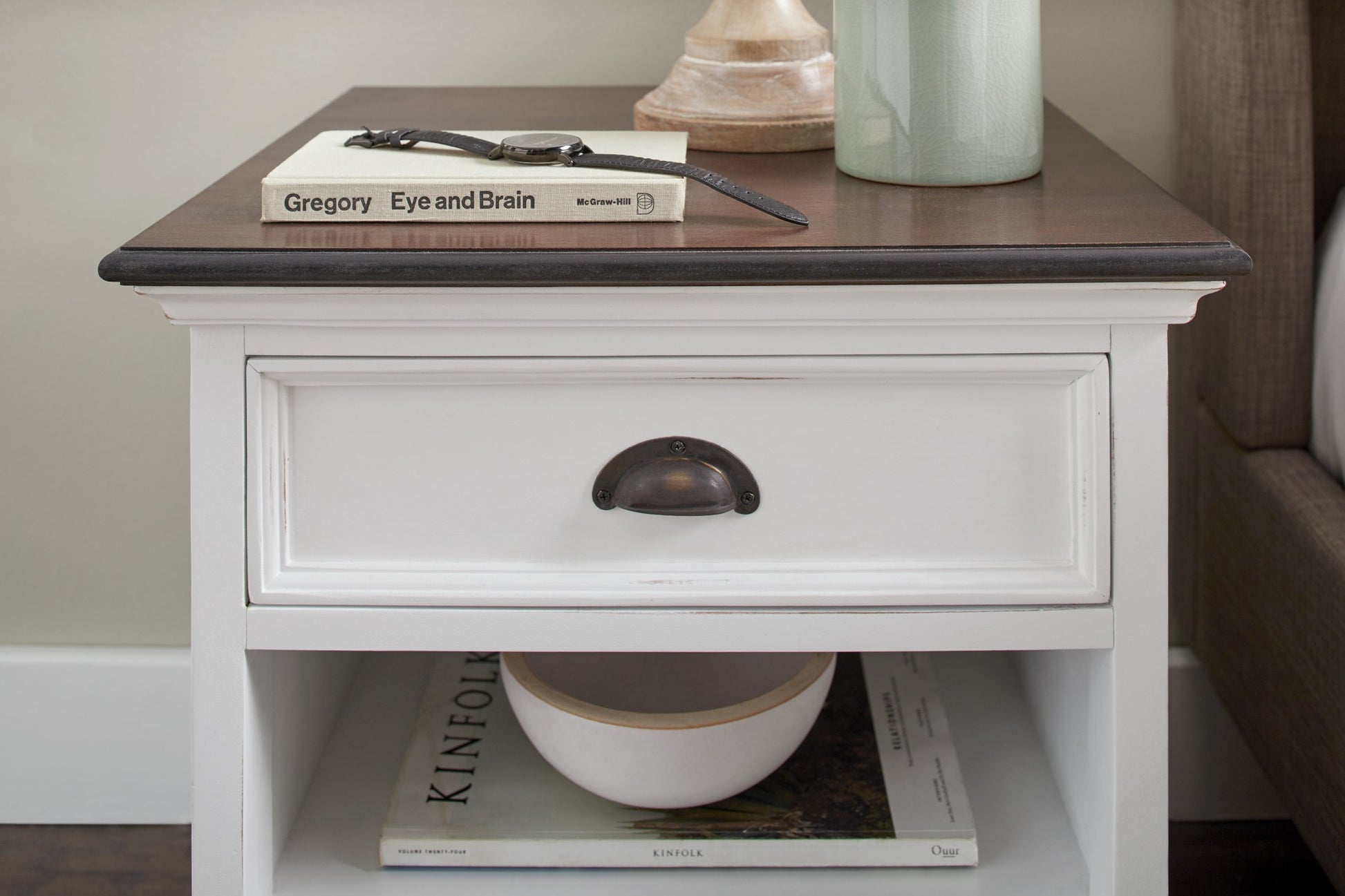 Distressed White and Deep Brown Nightstand With Shelves