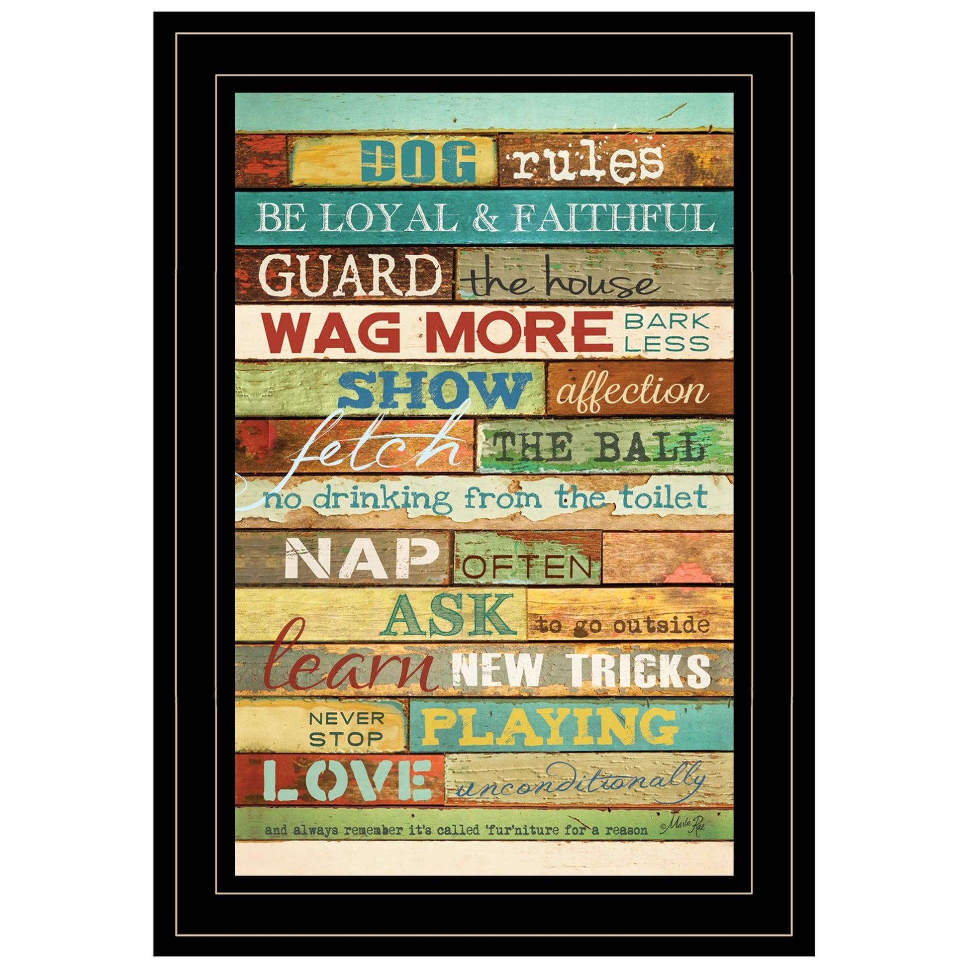 Add an air of fashion to your room and rejuvenate the space with this dog rules 4 black framed print wall art. This print is a visual artistic expression that allows you to decorate your space in style. Reproduced for you on paper, this hanging decorative accent will be a trendy and fashionable way to dress your walls. Hang on your wall to add some up to date fashion and decoration. Instantly liven up your space with this art that brings color and dimension to your walls. 11 inches H x 15 inches W x 1 inches D