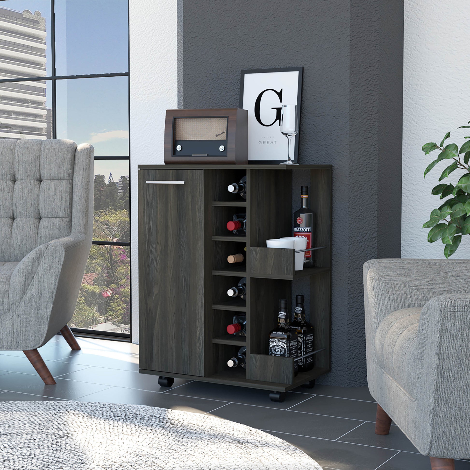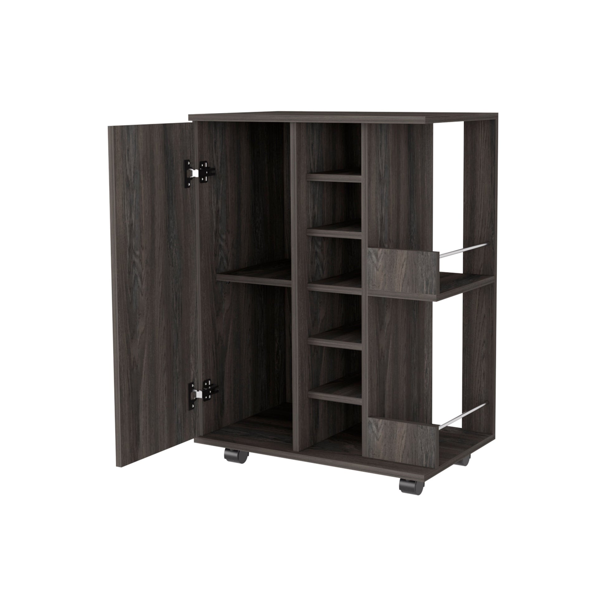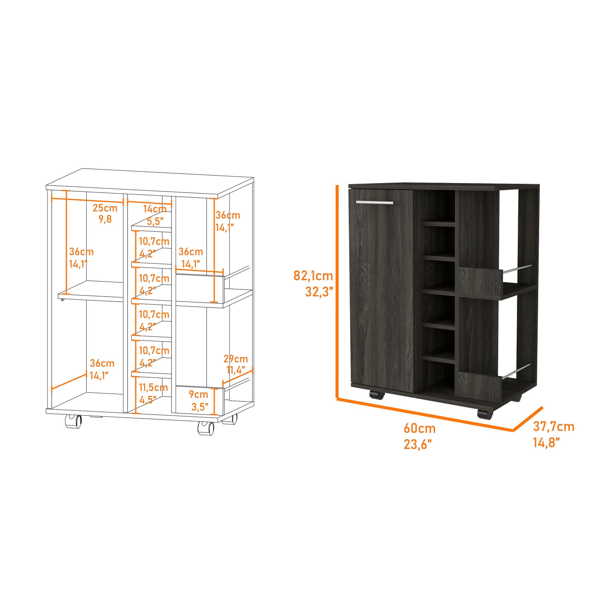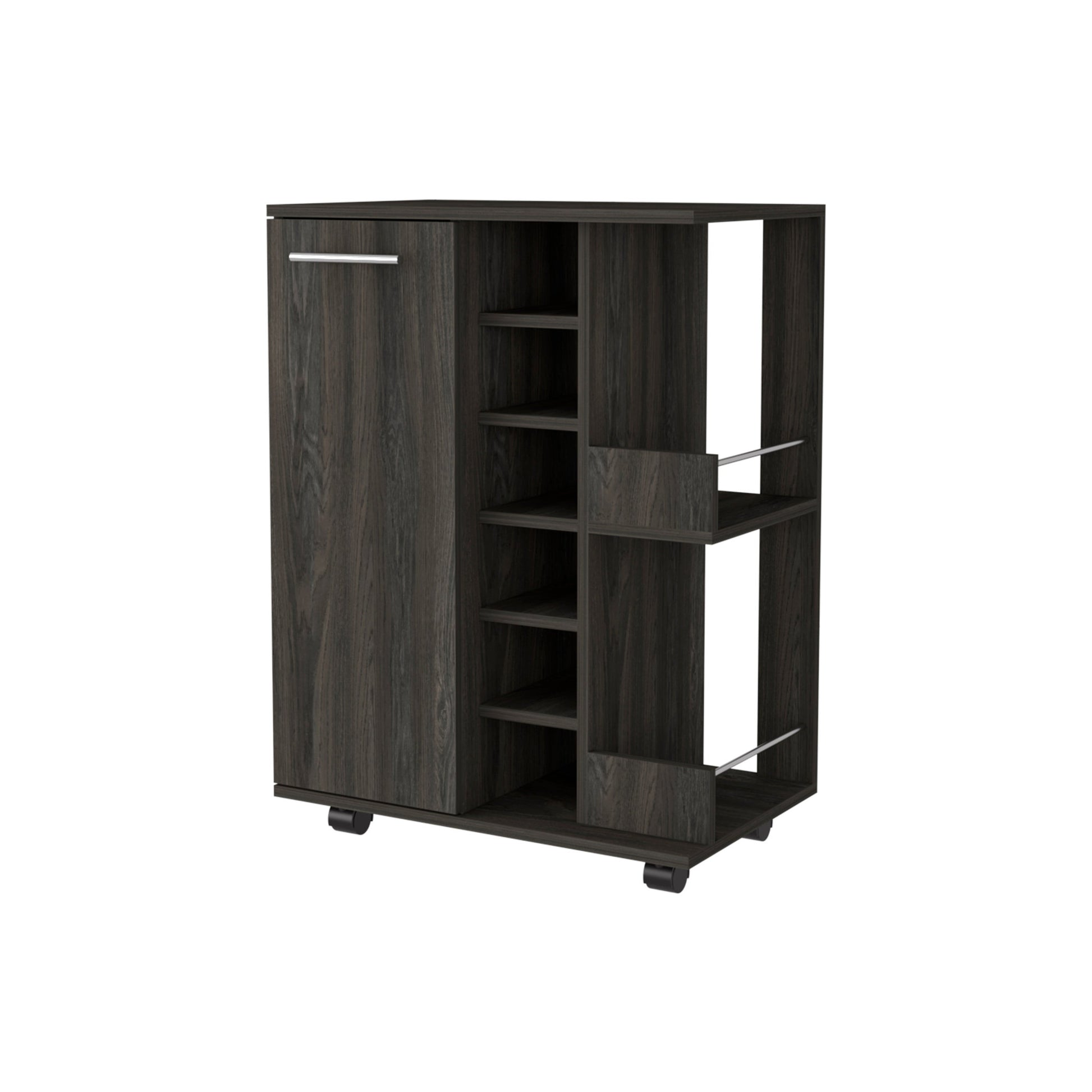 This espresso rolling bar cart with wine storage is an essential addition to any modern home. Crafted with a manufactured wood frame and top, this rectangular-shaped cart features cabinets for convenient storage. The cart is equipped with wheels, allowing for easy transportation from room to room. In a rich espresso color, this cart effortlessly complements any decor style. With its built-in wine storage, you can display and hold up to 6 bottles of your favorite wines. Perfect for entertaining guests or simply enjoying a quiet night at home, this bar cart combines functionality and style in one sleek design. Update your living space with this versatile and practical addition to your furniture collection. 32.32-inch H x 23.62-inch W x 14.76-inch D