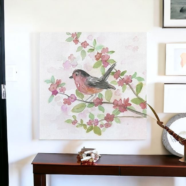 The flower and bird unframed print wall art is the perfect decorative accessory for your home. This print is a visual artistic expression that allows you to decorate your space in style. Reproduced for you on canvas, this hanging decorative accent will be a trendy and fashionable way to dress your walls. Adding this hanging wall art to your space to make your room feel more finished and attractive. Instantly liven up your space with this art that brings color and dimension to your walls. 20 inches H x 20 inches W x 1.25 inches D