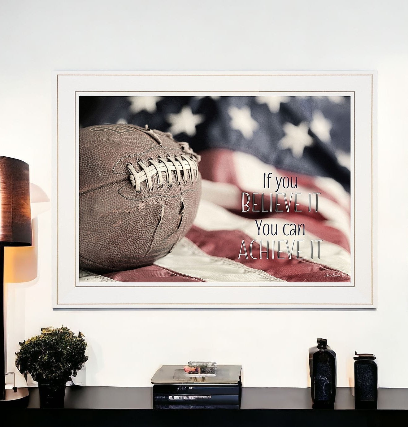 This football believe it 1 white framed print wall art will add a beautiful decorative accent to your decor. This print is a visual artistic expression that allows you to decorate your space in style. Reproduced for you on paper, this hanging decorative accent will be a trendy and fashionable way to dress your walls. Hang on your wall to add some up to date fashion and decoration. Utilize this opportunity to create a focal point in the room with this fabulous wall decor option. 15-inch H x 21-inch W x 1-inch D