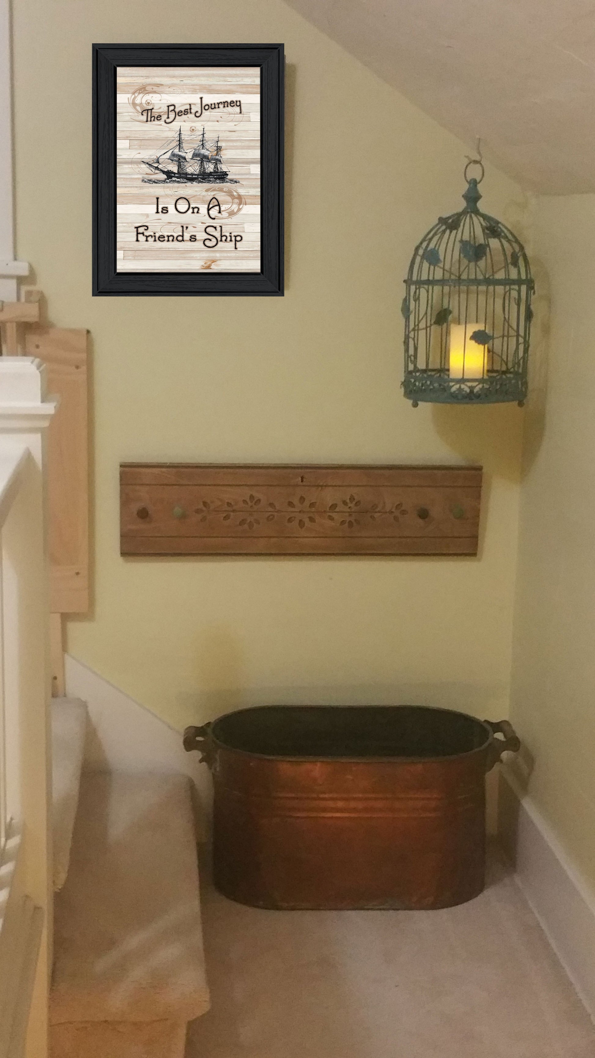 The friendship journey 1 black framed print wall art is the perfect decorative accessory for your home. This transportation inspired wall art features a ship icon and will bring a refreshing look and perspective to your walls. This print is a visual artistic expression that allows you to decorate your space in style. Reproduced for you on paper, this hanging decorative accent will be a trendy and fashionable way to dress your walls. Hang on your wall to add some up to date fashion and decoration. Instantly liven up your space with this art that brings color and dimension to your walls. 15 inches H x 11 inches W x 1 inches D