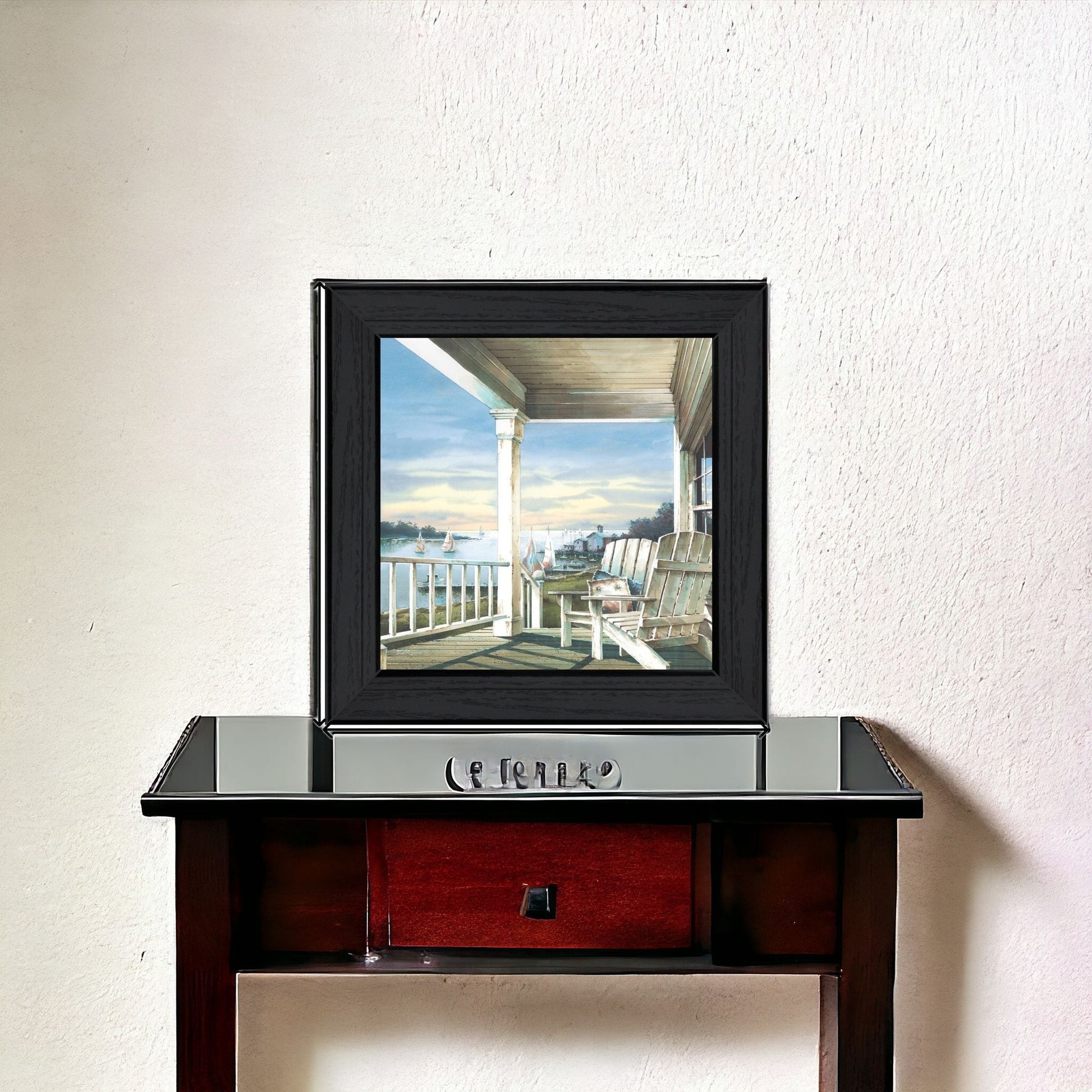 This front porch coastal sunset black framed print wall art will add a beautiful decorative accent to your decor. This print is a visual artistic expression that allows you to decorate your space in style. Reproduced for you on paper, this hanging decorative accent will be a trendy and fashionable way to dress your walls. Hang on your wall to add some up to date fashion and decoration. Instantly liven up your space with this art that brings color and dimension to your walls. 14 inches H x 14 inches W x 1 inches D