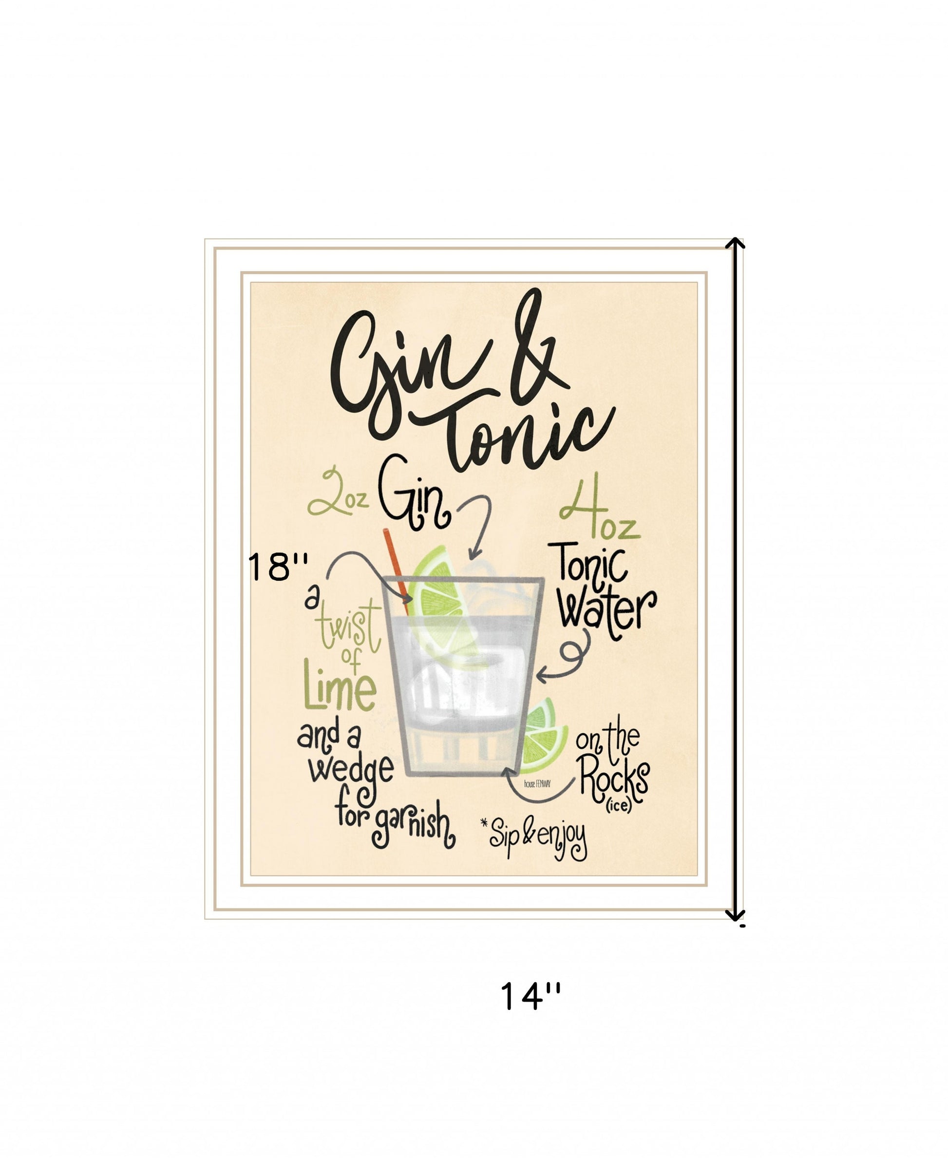Bring some sizzle to your space with this eye-catching gin and tonic white framed print wall art. This print is a visual artistic expression that allows you to decorate your space in style. Reproduced for you on wood, this hanging decorative accent will be a trendy and fashionable way to dress your walls in a rustic and modern farmhouse vibe. Hang on your wall to add some up to date fashion and decoration. Utilize this opportunity to create a focal point in the room with this fabulous wall decor option. 18 inches H x 14 inches W x 1 inches D