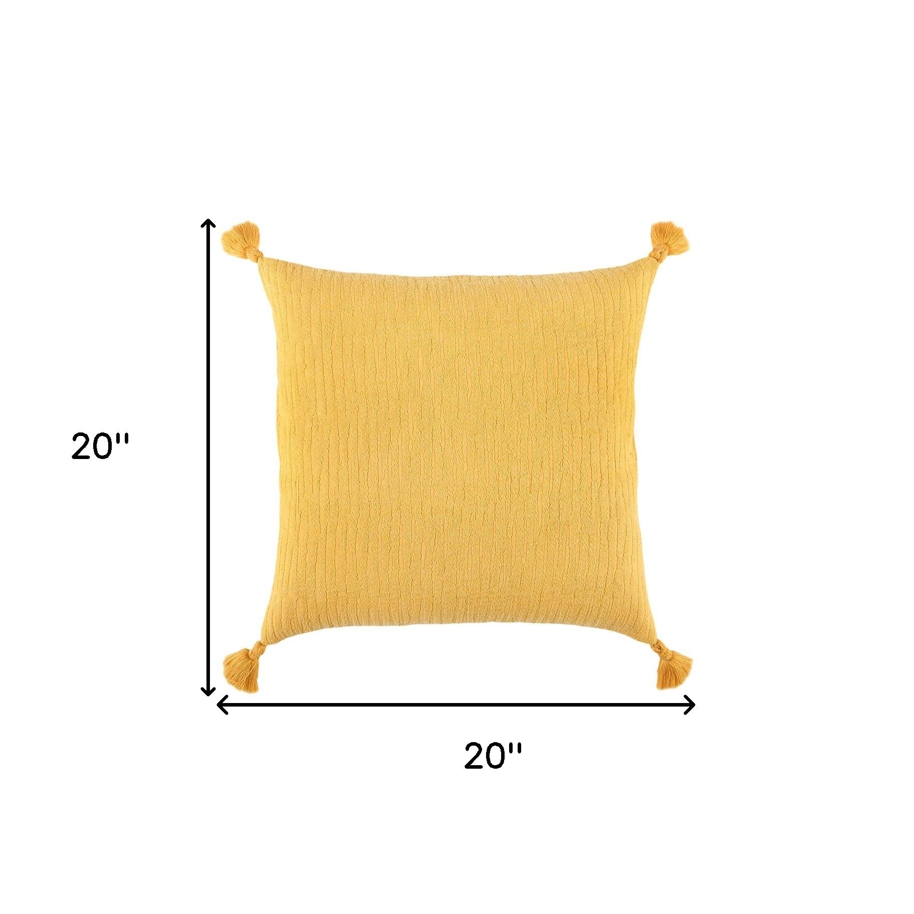 Sophisticatedly modern with a bohemian flair, this Gold Solid Tonal Abstract Stripe Throw Pillow is an episode of style and simplicity to spruce up your living space. The solid golden yellow base features slightly raised abstract stripe patterning for texture while the four cotton corner tassels add a cheerful element to the pillow. Crafted from top-quality cotton fabric for enhanced durability and the polyfill insert makes it super soft, fluffy, and cuddly. The knife edging on the pillow ensures a clean and modern look to make it a suitable accent for a variety of interior styles. The solid coordination back sports a hidden zipper closure for convenience. Give your modern home a stylish visual appeal with this decorative throw pillow on the sofa or couch. 20” x 20” x 6.25”
