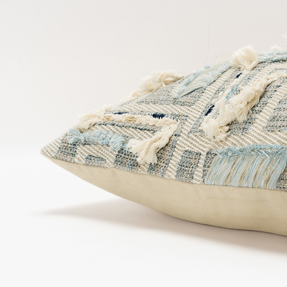 This timeless Gray Blue Appliqued Maze Modern Throw Pillow is sure to add dimension and texture layered into your modern interior. The pillow features a gray maze-like pattern woven with yarn chords in powder blue that are hand applied and joined together with a satin stitch while the frayed ends are kept to add volume and texture to the piece. The pillow is constructed with a top-notch cotton fabric that is soft to the touch with extended durability and comes with a plush polyfill insert that gives it a soft and fluffy nature. The same material is featured on the back in a solid color with a zipper for convenience. Knife edges give the pillow a crisp and polished look fit for a variety of interior styles. This throw pillow is the perfect combination of boho patterns against a modern design to add a touch of sophistication and class to your home. 20" x 20" x 6.25”