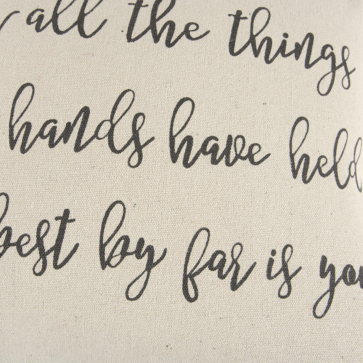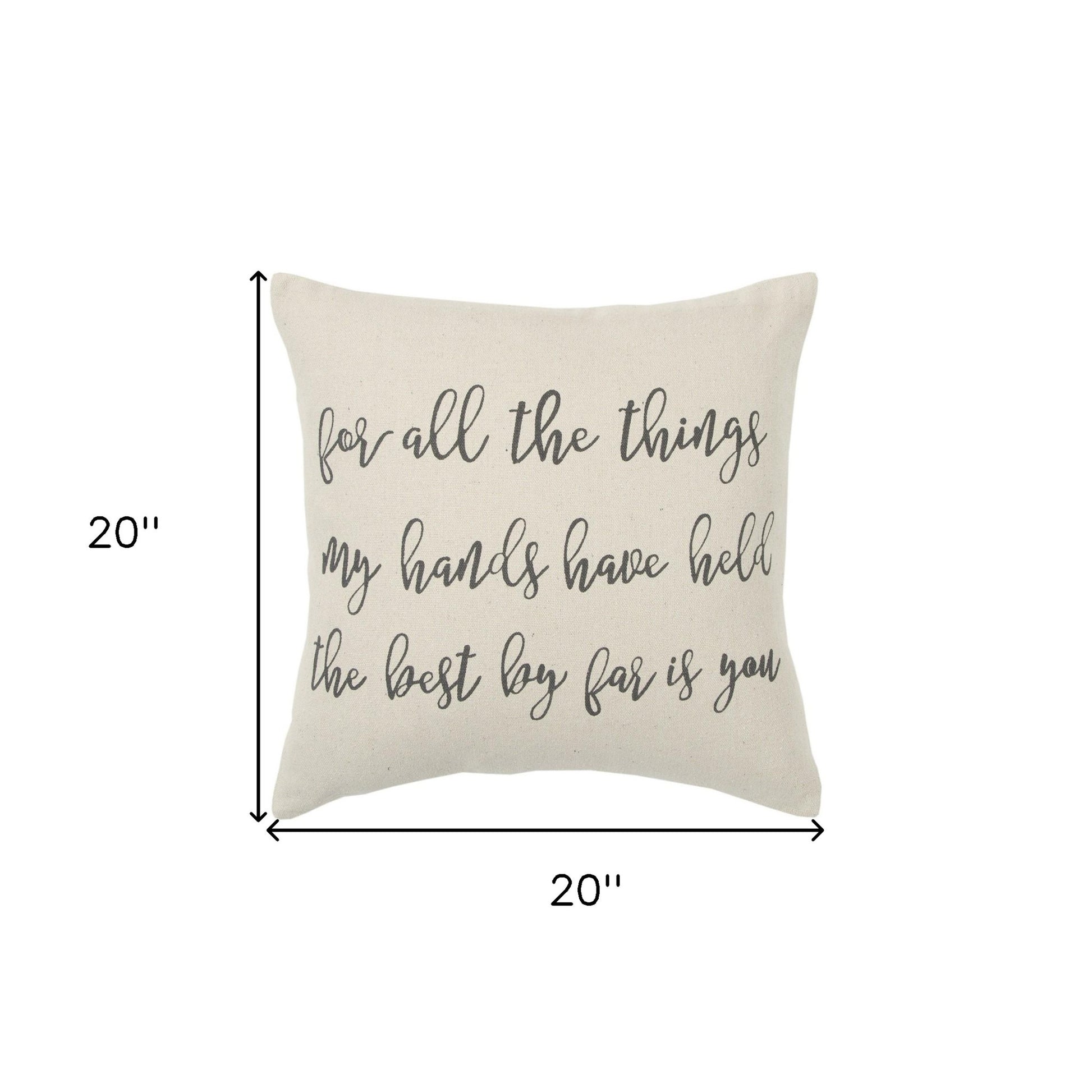 Embracing a modern color palette with utmost simplicity, this Gray Taupe All The Things Throw Pillow will perfectly work well with any bright or bold-toned decors. The playful romantic sentiment stating ‘for all the things my hands have held the best by far is you’ is written in a cursive gray font over a cream-colored base for a classy appearance. The light texture of the cotton fabric gives a luxurious feel on the tough while the knife edging ensures a clean look with crisp corners for a modern appeal. The back of the pillow is in a solid color as the front and features a hidden zipper closure, making the poly-filled pillow easy to clean and maintain. This decorative throw pillow will be a sophisticated addition to enhance your casual décor with a stylish edge. 20” x 20” x 6.25”