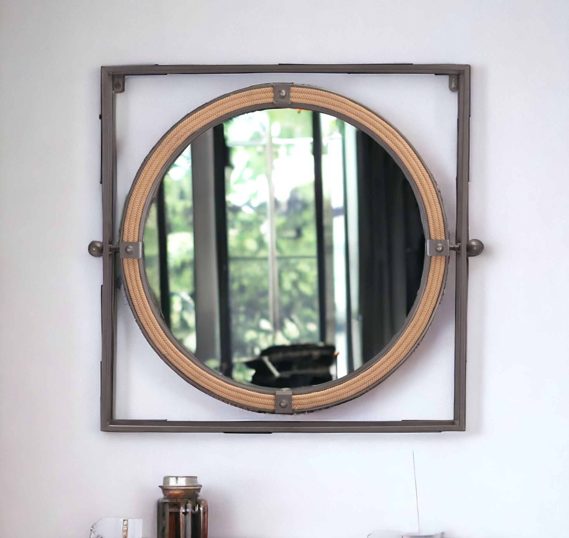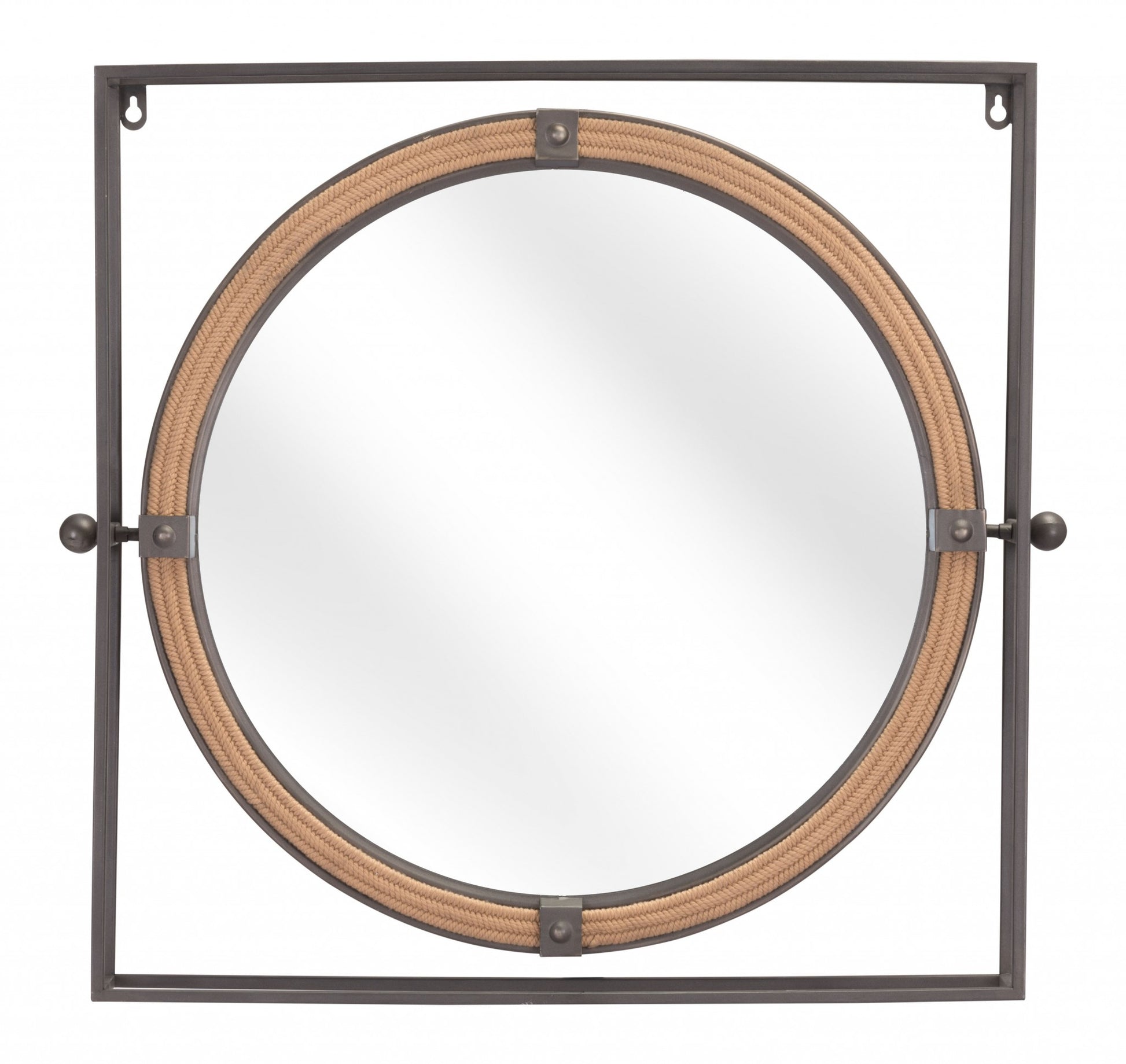 This gray metal nautical round mirror will take you back to the summer with its shape that resembles the window of a boat. The frame around the circular mirror is made from stainless steel and is finished to gray finish. There is a square frame inside of which the circular framed mirror resides. The circular frame features braided rope detail with stainless steel gray clasps on the four center points. The mirror in the middle reflects light and bring in brightness and a feeling of space in any room you use this mirror in. This mirror is great for personal use and even better as a house-warming gift for your friends and family. A hardware kit is included in the package to help in installing the mirror. Product 21.7" H x 23.6" W x 3.1" D. Mirror 28" H x 16" W