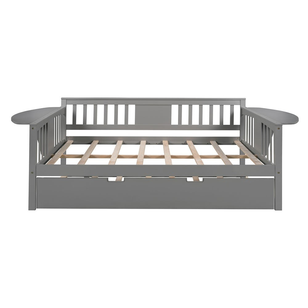 The gray solid and manufactured wood bed with trundle is the ultimate combination for your bedroom of comfort and style. Save space during the day with this twin rolling platform that stows away under the primary bed to pull out for an additional sleeping space. Quality craftsmanship in every facet of production ensures durability and long-lasting wear this bed will help to create a peaceful environment that will provide restful slumber for years to come. 34-inch H x 56-inch W x 80-inch D