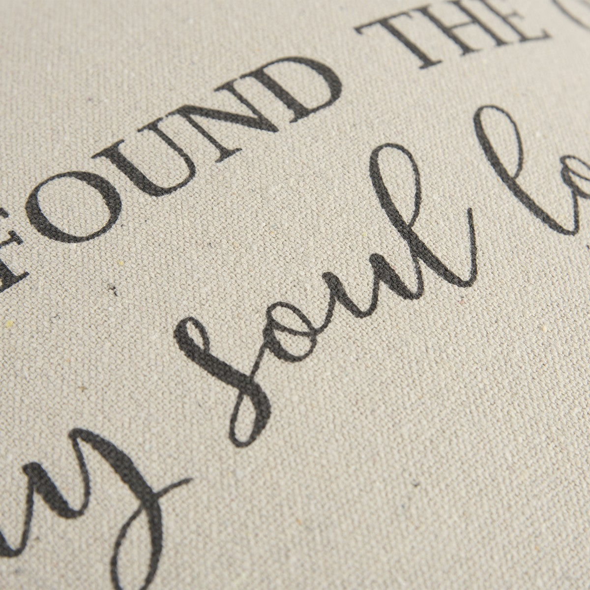 Evoke a sense of love in the air with this sophisticatedly designed Gray Taupe Canvas Found the One Throw Pillow in your living room. Featuring a romantic sentiment that says ‘I Have Found The One my soul loves’ in soft gray over the taupe background to make your modern space feel lovely and inviting with a stylish appeal. The lightly textured cotton fabric gives a cozy feel on the touch while the self-flange edges prevent fraying, making the pillow a suitable accent for a range of interior themes. This poly-filled pillow features a removable cover for easy cleaning. The neutral hues and clean design of this decorative throw pillow will perfectly complement the aesthetics of any modern or contemporary abode. 20” x 20” x 6.25”